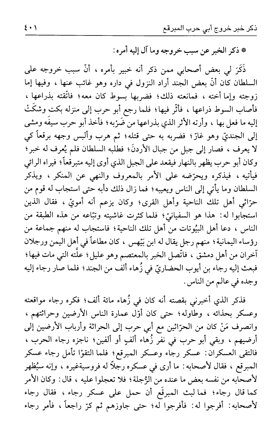 فذكر الذي أخبرني بقصته أنه كان في زُهاء مائة ألف؛ فكره رجاء مواقعته وعسكر بحذائه، وطاوله؛ حتى كان أوّل عمارة الناس الأرضين وحراثتهم، وانصرف مَنْ كان من الحرّاثين مع أبي حرب إلى الحراثة وأرباب الأرضين إلى أرضيهم، وبقي أبو حرب في نفر زُهاء ألفٍ أو ألفين؛ ناجزه رجاء الحرب، فالتقى العسكران: عسكر رجاء وعسكر المبرقع؛ فلما التقوْا تأمل رجاء عسكر المبرقع، فقال لأصحابه: ما أرى في عسكره رجلًا له فروسية غيره، وإنه سيُظهر لأصحابه من نفسه بعض ما عنده من الرُّجلة؛ فلا تعجلوا عليه، قال: وكان الأمر كما قال رجاء؛ فما لبث المبرقَع أن حمل على عسكر رجاء، فقال رجاء لأصحابه: أفرجوا له: فأفرجوا له؛ حتى جاوزهم ثم كرّ راجعًا، فأمر رجاء