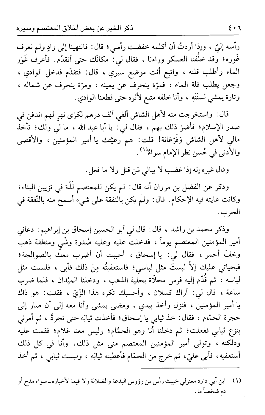 رأسه إليّ، وإذا أردتُ أن أكلمه خفضت رأسي؛ قال: فانتهينا إلى وادٍ ولم نعرف غَوره؛ وقد خلَّفنا العسكر وراءنا، فقال لي: مكانَك حتى أتقدّم. فأعرف غَوْر الماء وأطلب قلته، واتبع أنت موضع سيري، قال: فتقدّم فدخل الوادي، وجعل يطلب قلة الماء، فمرّة ينحرف عن يمينه، ومرّة ينحرف عن شماله، وتارة يمشي لسنَنَهِ، وأنا خلفه متبع لأثره حتى قطعنا الوادي.