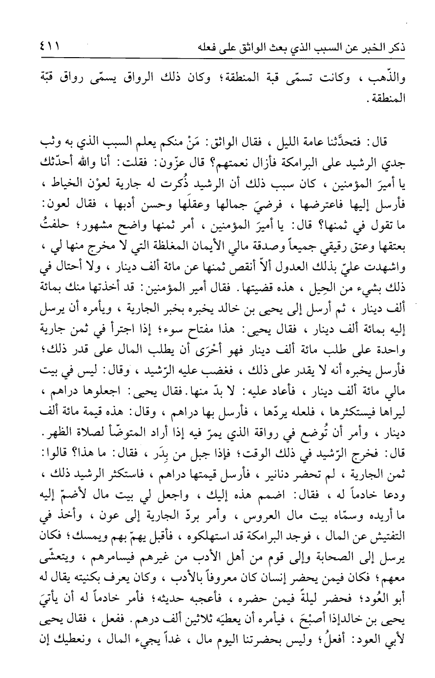 قال: فتحدَّثنا عامة الليل، فقال الواثق: مَنْ منكم يعلم السبب الذي به وثب جدي الرشيد على البرامكة فأزال نعمتهم؟ قال عزّون: فقلت: أنا والله أحدّثك يا أميرَ المؤمنين، كان سبب ذلك أن الرشيد ذُكرت له جارية لعوْن الخياط، فأرسل إليها فاعترضها، فرضيَ جمالها وعقلَها وحسن أدبها، فقال لعون: ما تقول في ثمنها؟ قال: يا أميرَ المؤمنين، أمر ثمنها واضح مشهور؛ حلفتُ بعتقها وعتق رقيقي جميعًا وصدقة مالي الأيمان المغلظة التي لا مخرج منها لي، واشهدت عليّ بذلك العدول ألّا أنقص ثمنها عن مائة ألف دينار، ولا أحتال في ذلك بشيء من الحِيل، هذه قضيتها. فقال أمير المؤمنين: قد أخذتها منك بمائة ألف دينار، ثم أرسل إلى يحيى بن خالد يخبره بخبر الجارية، ويأمره أن يرسل إليه بمائة ألف دينار، فقال يحيى: هذا مفتاح سوء، إذا اجترأ في ثمن جارية واحدة على طلب مائة ألف دينار فهو أحْرَى أن يطلب المال على قدر ذلك؛ فأرسل يخبره أنه لا يقدر على ذلك، فغضب عليه الرّشيد، وقال: ليس في بيت مالي مائة ألف دينار، فأعاد عليه: لا بدّ منها. فقال يحيى: اجعلوها دراهم، ليراها فيستكثرها، فلعله يردّها، فأرسل بها دراهم، وقال: هذه قيمة مائة ألف دينار، وأمر أن تُوضع في رواقة الذي يمرّ فيه إذا أراد المتوضّأ لصلاة الظهر. قال: فخرج الرّشيد في ذلك الوقت؛ فإذا جبل من بِدَر، فقال: ما هذا؟ قالوا: ثمن الجارية، لم تحضر دنانير، فأرسل قيمتها دراهم، فاستكثر الرشيد ذلك، ودعا خادمًا له، فقال: اضمم هذه إليك، واجعل لي بيت مال لأضمّ إليه ما أريده وسمّاه بيت مال العروس، وأمر بردّ الجارية إلى عون، وأخذ في التفتيش عن المال، فوجد البرامكة قد استهلكوه، فأقبل يهمّ بهم ويمسك؛ فكان يرسل إلى الصحابة وإلى قوم من أهل الأدب من غيرهم فيسامرهم، ويتعشّى معهم؛ فكان فيمن يحضر إنسان كان معروفًا بالأدب، وكان يعرف بكنيته يقال له أبو العُود؛ فحضر ليلةً فيمن حضره، فأعجبه حديثه؛ فأمر خادمًا له أن يأتيَ يحيى بن خالد إذا أصبْحَ، فيأمره أن يعطيَه ثلاثين ألف درهم. ففعل، فقال يحيى لأبي العود: أفعلُ؛ وليس بحضرتنا اليوم مال، غدًا يجيء المال، ونعطيك إن