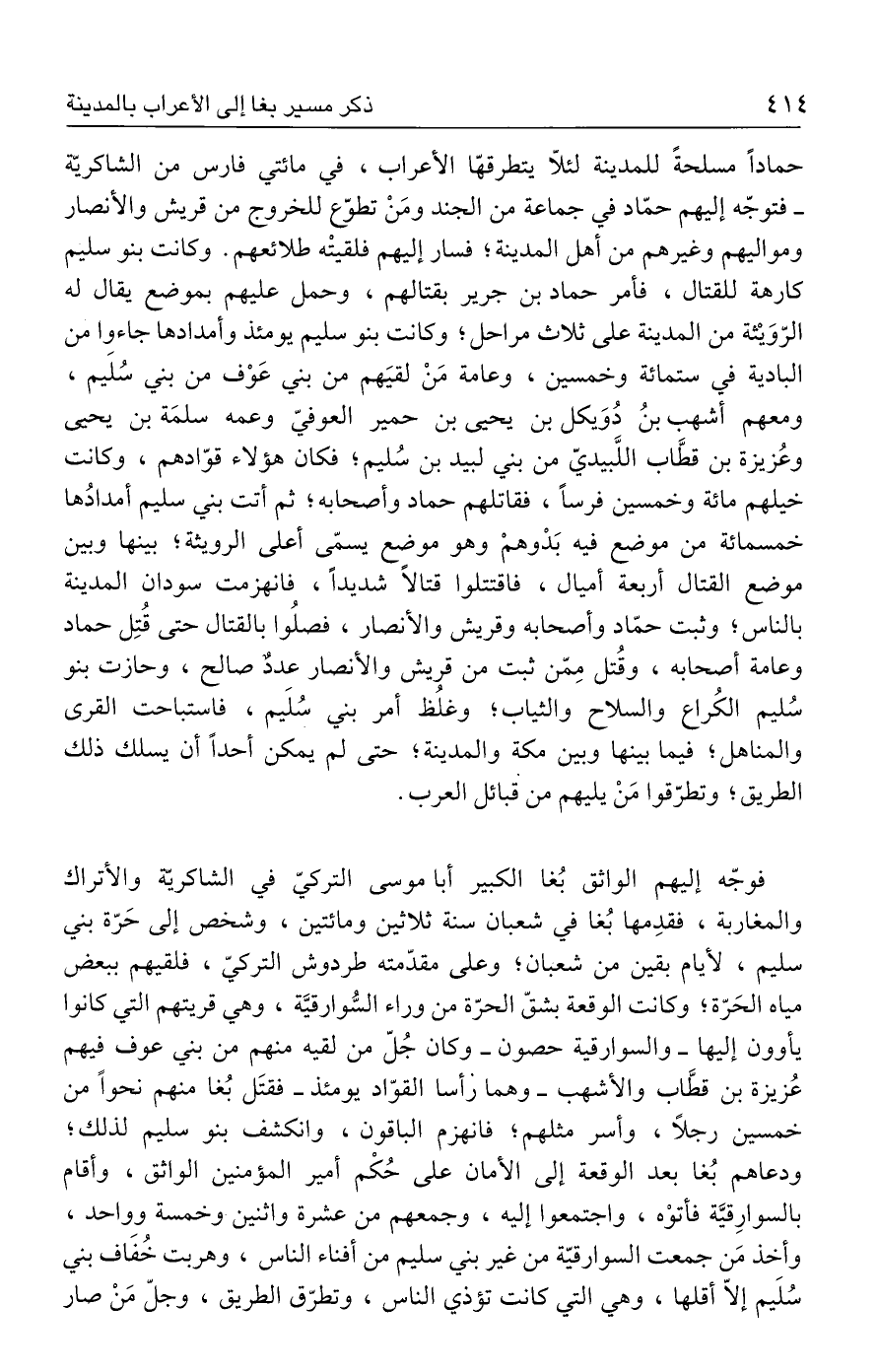 فوجّه إليهم الواثق بُغا الكبير أبا موسى التركيّ في الشاكريّة والأتراك والمغاربة، فقدِمها بُغا في شعبان سنة ثلاثين ومائتين، وشخص إلى حَرّة بني سليم، لأيام بقين من شعبان، وعلى مقدّمته طردوش التركيّ، فلقيهم ببعض مياه الحَرّة؛ وكانت الوقعة بشقّ الحرّة من وراء السُّوارقيَّة، وهي قريتهم التي كانوا يأوون إليها - والسوارقية حصون - وكان جُلّ من لقيه منهم من بني عوف فيهم عُزيزة بن قطَّاب والأشهب - وهما رأسا القوّاد يومئذ - فقتَل بُغا منهم نحوًا من خمسين رجلًا، وأسر مثلهم؛ فانهزم الباقون، وانكشف بنو سليم لذلك؛ ودعاهم بُغا بعد الوقعة إلى الأمان على حُكْم أمير المؤمنين الواثق، وأقام بالسوارِقيَّة فأتوْه، واجتمعوا إليه، وجمعهم من عشرة واثنين وخمسة وواحد، وأخذ مَن جمعت السوارقيّة من غير بني سليم من أفناء الناس، وهربت خُفَاف بني سُلَيم إلّا أقلها، وهي التي كانت تؤذي الناس، وتطرّق الطريق، وجلّ مَنْ صار