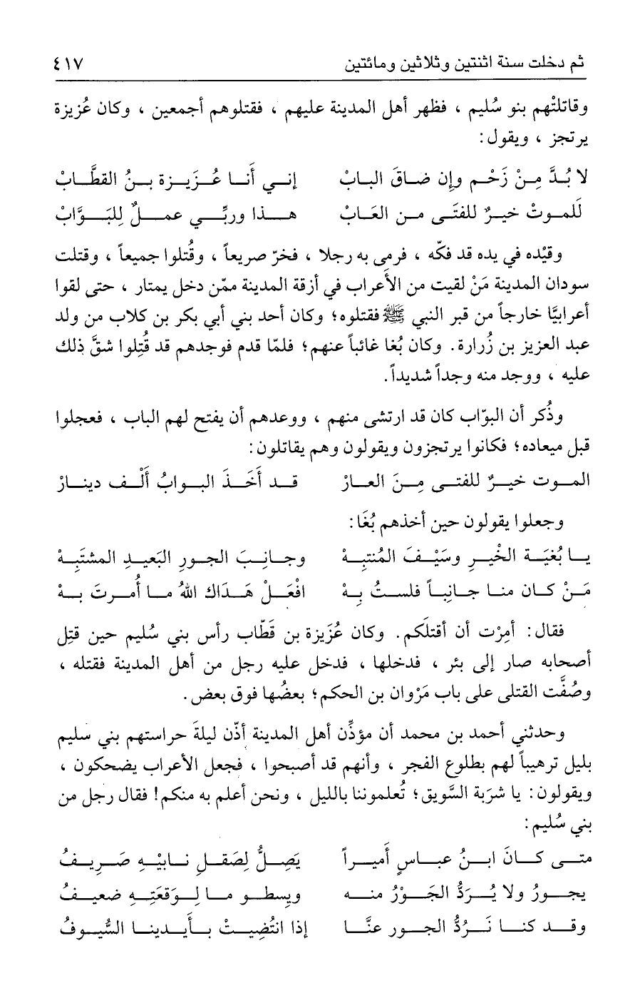 وقاتلتْهم بنو سُليم، فظهر أهل المدينة عليهم، فقتلوهم أجمعين، وكان عُزيزة يرتجز، ويقول: