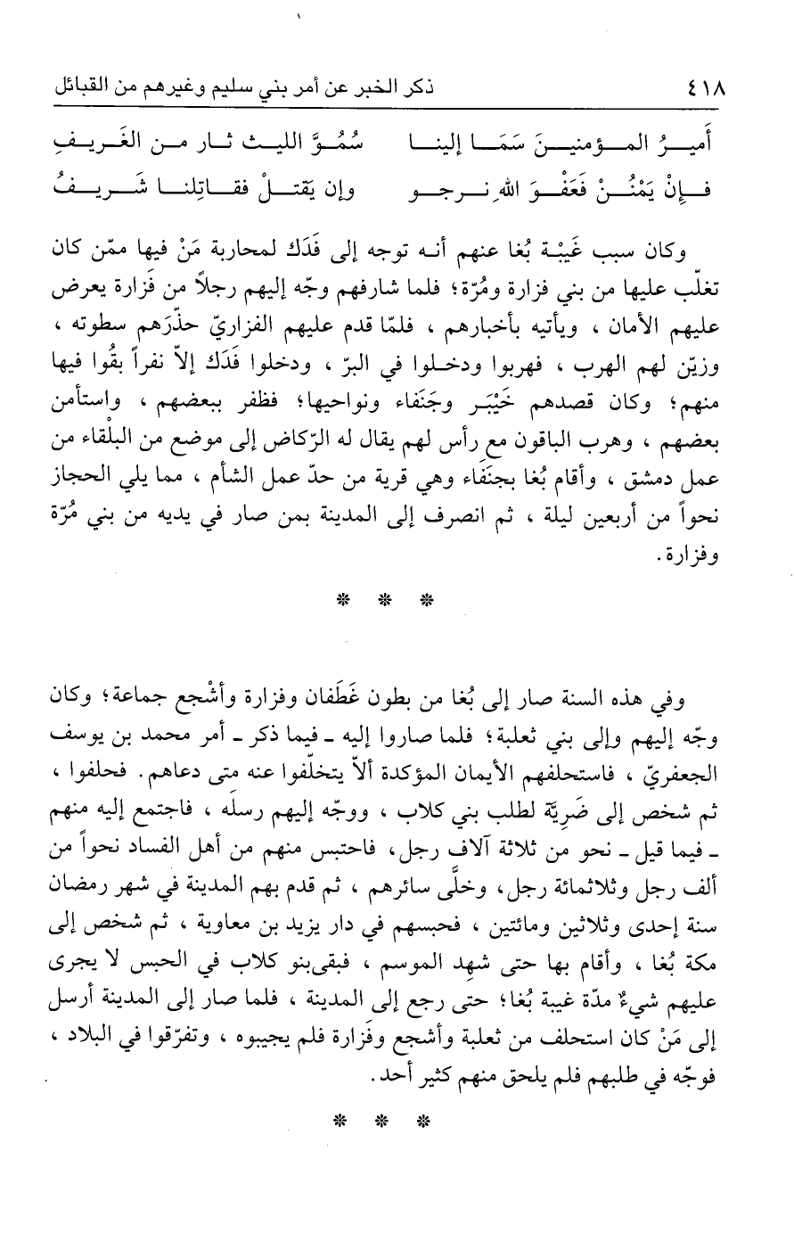 وفي هذه السنة صار إلى بُغا من بطون غَطَفان وفزارة وأشْجع جماعة؛ وكان وجّه إليهم وإلى بني ثعلبة؛ فلما صاروا إليه - فيما ذكر - أمر محمد بن يوسف الجعفريّ، فاستحلفهم الأيمان المؤكدة ألّا يتخلّفوا عنه متى دعاهم. فحلفوا، ثم شخص إلى ضَرِيّة لطلب بني كلاب، ووجّه إليهم رسلَه، فاجتمع إليه منهم - فيما قيل - نحو من ثلاثة آلاف رجل، فاحتبس منهم من أهل الفساد نحوًا من ألف رجل وثلاثمائة رجل، وخلَّى سائرهم، ثم قدم بهم المدينة في شهر رمضان سنة إحدى وثلاثين ومائتين، فحبسهم في دار يزيد بن معاوية، ثم شخص إلى مكة بُغا، وأقام بها حتى شهِد الموسم، فبقى بنو كلاب في الحبس لا يجرى عليهم شيءٌ مدّة غيبة بُغا؛ حتى رجع إلى المدينة، فلما صار إلى المدينة أرسل إلى مَنْ كان استحلف من ثعلبة وأشجع وفَزارة فلم يجيبوه، وتفرّفوا في البلاد، فوجّه في طلبهم فلم يلحق منهم كثير أحد.