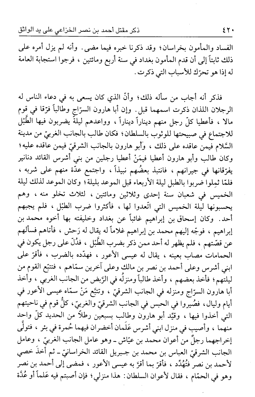 فذكر أنه أجاب من سأله ذلك؛ وأنّ الذي كان يسعى به في دعاء الناس له الرجلان اللذان ذكرت اسمهما قبل. وإن أبا هارون السرّاج وطالبًا فرّقا في قوم مالا، فأعطيا كلّ رجل منهم دينارًا دينارًا، وواعدهم ليلةً يضربون فيها الطَّبْل للاجتماع في صبيحتها للوثوب بالسلطان؛ فكان طالب بالجانب الغربيّ من مدينة السَّلام فيمن عاقده على ذلك، وأبو هارون بالجانب الشرقيّ فيمن عاقده عليه؛ وكان طالب وأبو هارون أعطيا فيمَنْ أعطيا رجلين من بني أشرس القائد دنانير يفرّقانها في جيرانهم، فانتبذ بعضُهم نبيذًا، واجتمع عدّة منهم على شربه، فلمّا ثمِلوا ضربوا بالطبل ليلة الأربعاء قبل الموعد بليلة؛ وكان الموعد لذلك ليلة الخميس في شعبان سنة إحدى وثلاثين ومائتين، لثلاث تخلو منه، وهم يحسبونها ليلة الخميس التي اتّعدوا لها، فأكثروا ضرب الطبْل، فلم يجبهم أحد. وكان إسحاق بن إبراهيم غائبًا عن بغداد وخليفته بها أخوه محمد بن إبراهيم، فوجّه إليهم محمد بن إبراهيم غلامًا له يقال له رَحش، فأتاهم فسألهم عن قصّتهم، فلم يظهر له أحد ممن ذكر بضرب الطَّبْل، فدُل على رجل يكون في الحمامات مصاب بعينه، يقال له عيسى الأعور، فهدّده بالضرب، فأقرّ على ابني أشرس وعلى أحمد بن نصر بن مالك وعلى آخرين سمّاهم، فتتبّع القوم من ليلتهم؛ فأخذ بعضهم، وأخذ طالبًا ومنزلُه في الرَّبض من الجانب الغربي، وأخذ أبا هارون السرّاج ومنزله في الجانب الشرقيّ، وتتبَّع مَنْ سمّاه عيسى الأعور في أيام وليال، فصُيروا في الحبس في الجانب الشرقيّ والغربيّ، كلُّ قوم في ناحيتهم التي أخذوا فيها، وقيِّد أبو هارون وطالب بسبعين رطلًا من الحديد كلّ واحد منهما، وأصيب في منزل ابني أشرس عَلَمان أخضر ان فيهما حُمرة في بئر، فتولَّى إخراجهما رجلٌ من أعوان محمد بن عيّاش - وهو عامل الجانب الغربيّ، وعامل الجانب الشرقيّ العباس بن محمد بن جبريل القائد الخراسانيّ - ثم أخذَ خصي لأحمد بن نصر فتُهُدِّد، فأقرّ بما أقرَّ به عيسى الأعور، فمضى إلى أحمد بن نصر وهو في الحمّام، فقال لأعوان السلطان: هذا منزلي؛ فإن أصبتم فيه عَلمًا أو عُدَّة