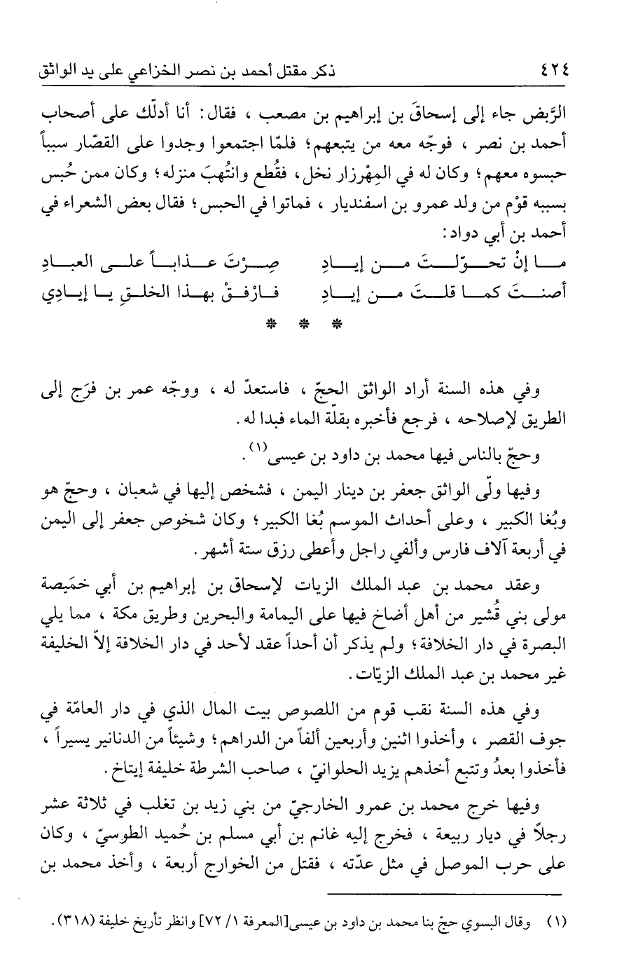 وعقد محمد بن عبد الملك الزيات لإسحاق بن إبراهيم بن أبي خمَيصة مولى بني قُشير من أهل أضاخ فيها على اليمامة والبحرين وطريق مكة، مما يلي البصرة في دار الخلافة؛ ولم يذكر أن أحدًا عقد لأحد في دار الخلافة إلّا الخليفة غير محمد بن عبد الملك الزيّات.
