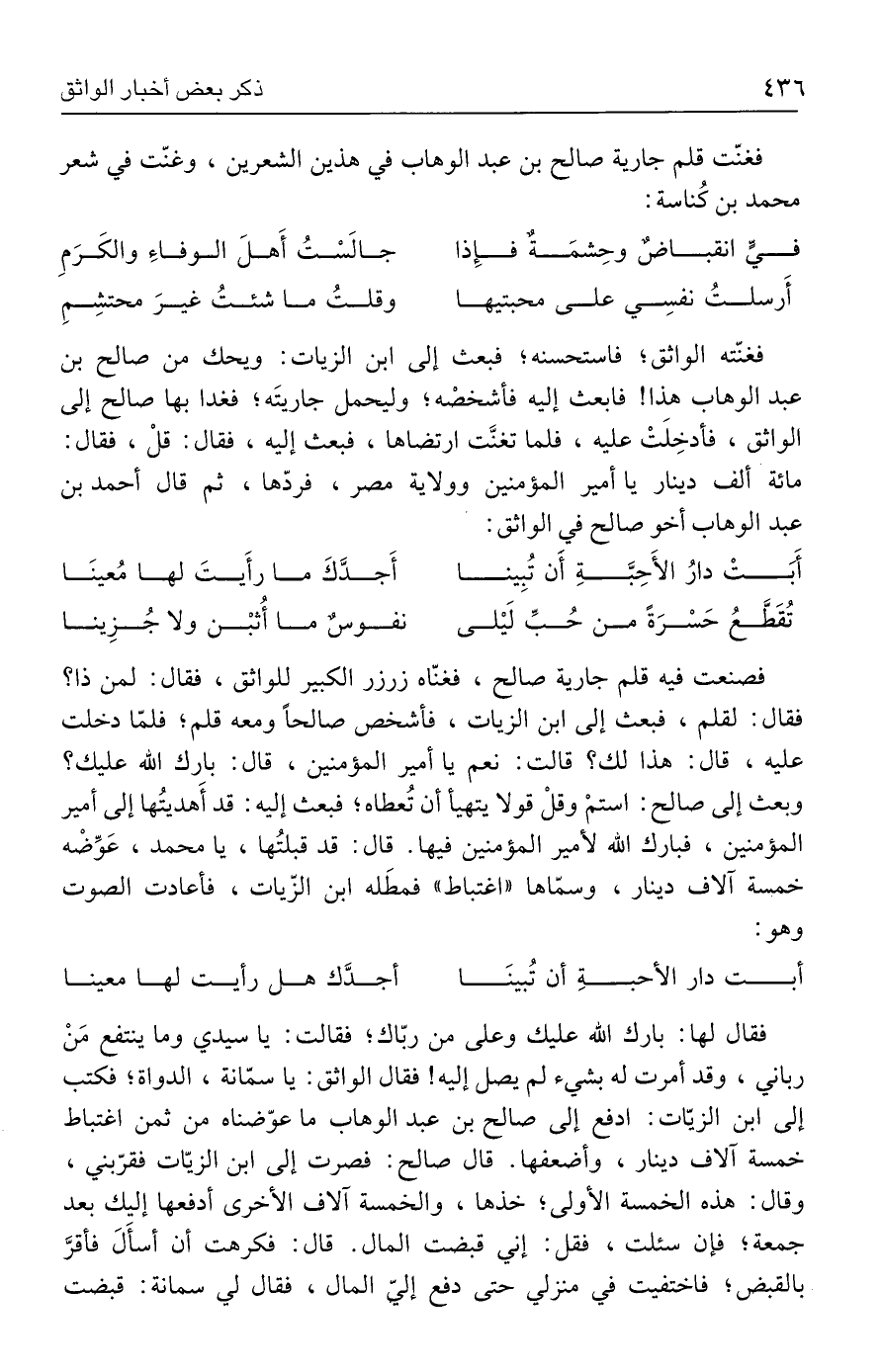 فصنعت فيه قلم جارية صالح، فغنّاه زرزر الكبير للواثق، فقال: لمن ذا؟ فقال: لقلم، فبعث إلى ابن الزيات، فأشخص صالحًا ومعه قلم؛ فلمّا دخلت عليه، قال: هذا لك؟ قالت: نعم يا أمير المؤمنين، قال: بارك الله عليك؟ وبعث إلى صالح: استمْ وقلْ قولا يتهيأ أن تعطاه؛ فبعث إليه: قد أَهديتُها إلى أمير المؤمنين، فبارك الله لأمير المؤمنين فيها. قال: قد قبلتها، يا محمد، عَوِّضْه خمسة آلاف دينار، وسمّاها "اغتباط" فمطَله ابن الزّيات، فأعادت الصوت وهو: