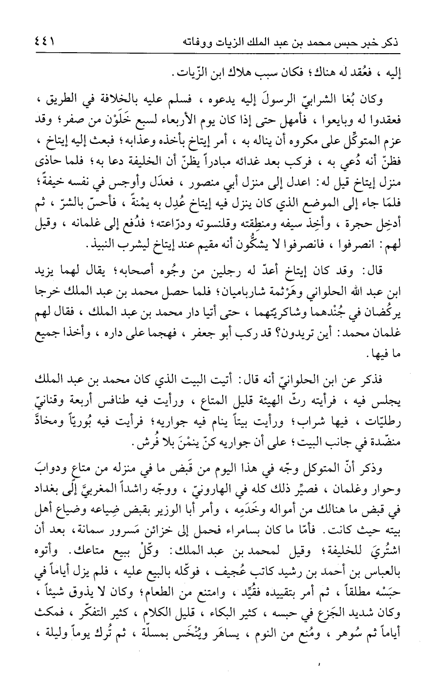 قال: وقد كان إيتاخ أعدّ له رجلين من وجُوه أصحابه؛ يقال لهما يزيد بن عبد الله الحلواني وهَرْثمة شارباميان؛ فلما حصل محمد بن عبد الملك خرجا يركُضان في جُنْدهما وشاكريّتهما، حتى أتيا دار محمد بن عبد الملك، فقال لهم غلمان محمد: أين تريدون؟ قد ركب أبو جعفر، فهجما على داره، وأخذا جميع ما فيها.