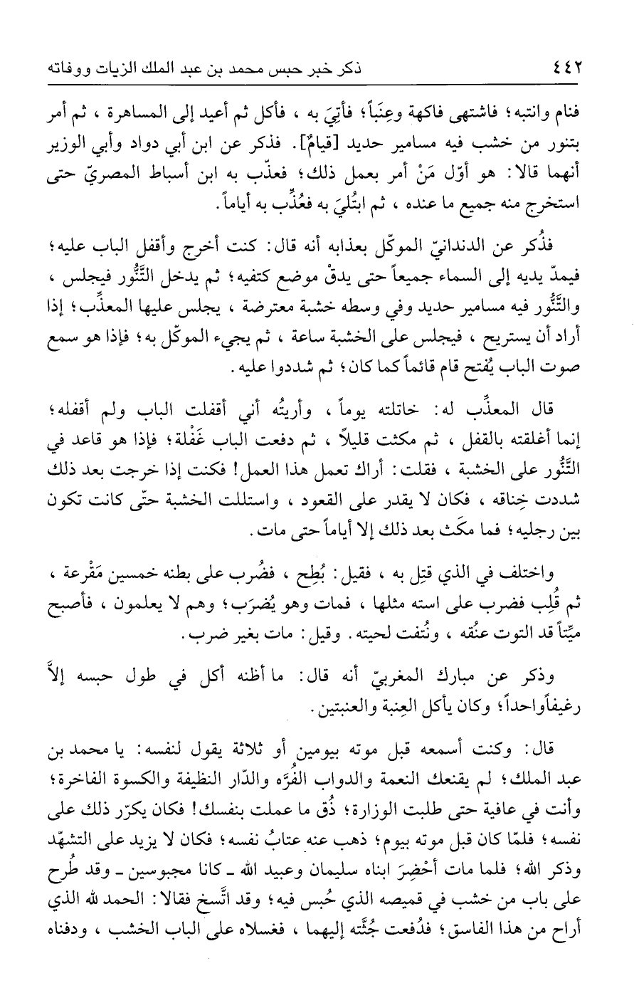 قال المعذِّب له: خاتلته يومًا، وأريتُه أني أقفلت الباب ولم أقفله؛ إنما أغلقته بالقفل، ثم مكثت قليلًا، ثم دفعت الباب غَفْلة؛ فإذا هو قاعد في التَّنُّور على الخشبة، فقلت: أراك تعمل هذا العمل! فكنت إذا خرجت بعد ذلك شددت خِناقه، فكان لا يقدر على القعود، واستللت الخشبة حتّى كانت تكون بين رجليه؛ فما مكَث بعد ذلك إلا أيامًا حتى مات.