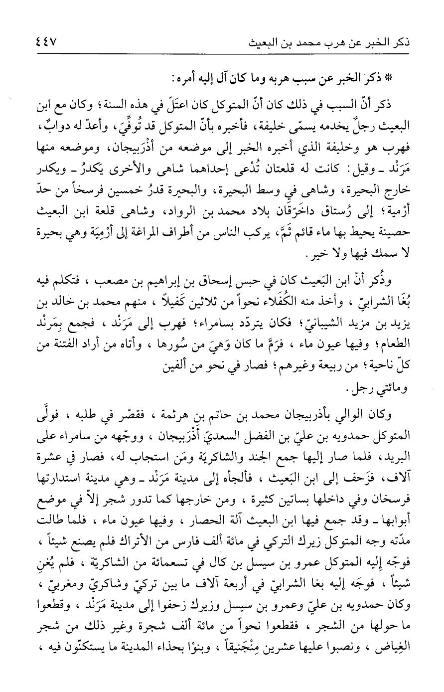 ذكر أنّ السبب في ذلك كان أنّ المتوكل كان اعتَلّ في هذه السنة؛ وكان مع ابن البعيث رجلٌ يخدمه يسمّى خليفة، فأخبره بأنّ المتوكل قد تُوفِّيَ، وأعدّ له دوابٌ، فهرب هو وخليفة الذي أخبره الخبر إلى موضعه من أذْرَبيجان، وموضعه منها مَرَنْد - وقيل: كانت له قلعتان تُدْعى إحداهما شاهى والأخرى يَكدرُ - ويكدر خارج البحيرة، وشاهى في وسط البحيرة، والبحيرة قدرُ خمسين فرسخًا من حدّ أرْمية؛ إلى رُستاق داخَرّقَان بلاد محمد بن الرواد، وشاهى قلعة ابن البعيث حصينة يحيط بها ماء قائم ثَمَ، يركب الناس من أطراف المراغة إلى أرْمِيَة وهي بحيرة لا سمك فيها ولا خير.