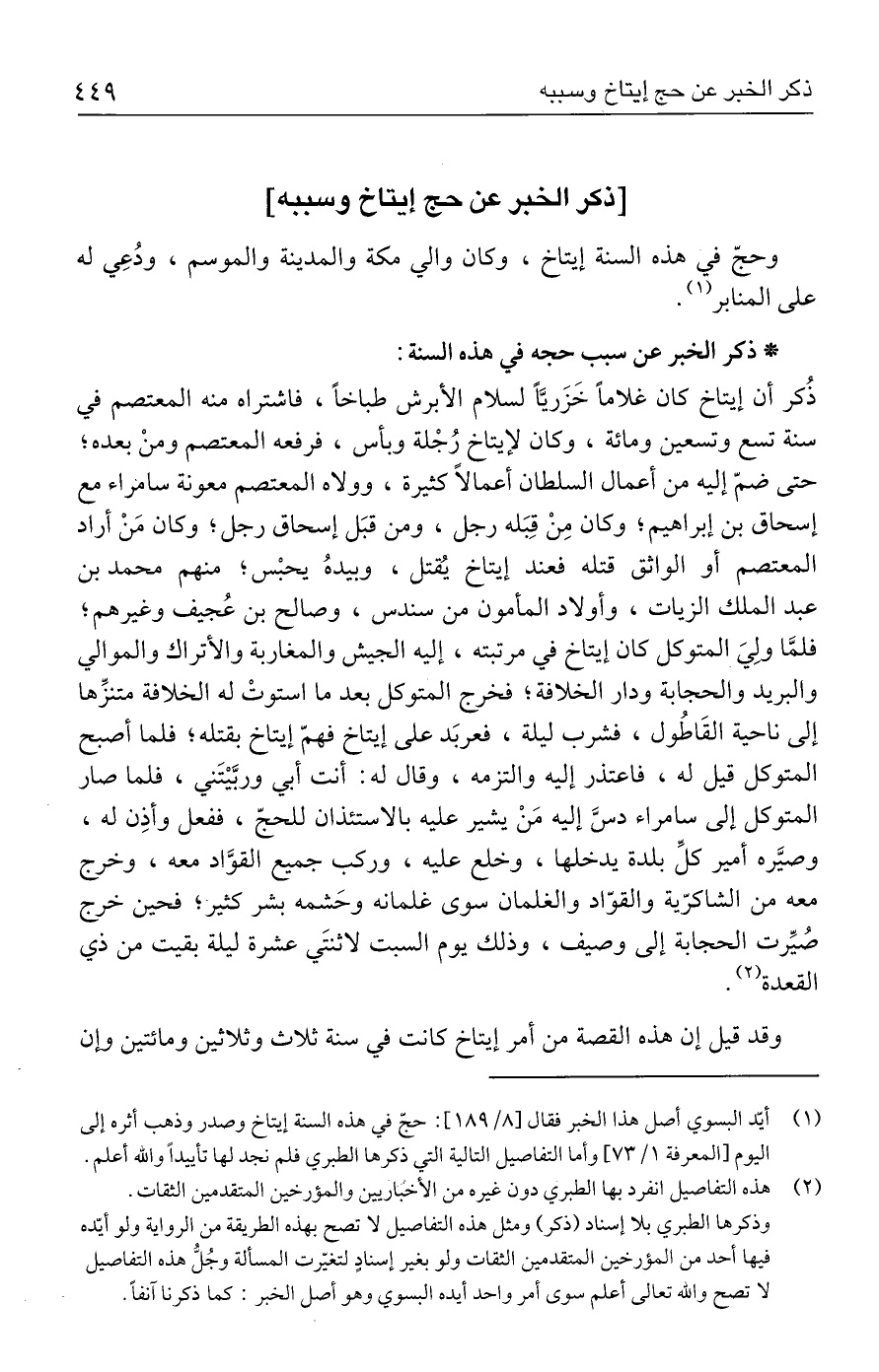 (١) أيّد البسوي أصل هذا الخبر فقال [٨/ ١٨٩]: حجّ في هذه السنة إيتاخ وصدر وذهب أثره إلى اليوم [المعرفة ١/ ٧٣]، وأما التفاصيل التالية التي ذكرها الطبري فلم نجد لها تأييدًا والله أعلم.