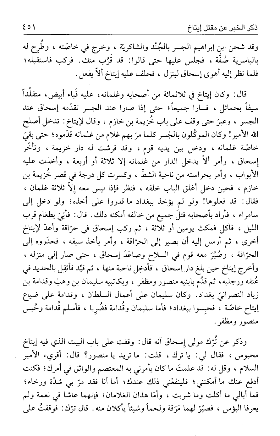قال: وكان إيتاخ في ثلاثمائة من أصحابه وغلمانه، عليه قَباء أبيض، متقلّدًا سيفًا بحمائل، فسارا جميعًا؛ حتى إذا صارا عند الجسر تقدّمه إسحاق عند الجسر، وعبرَ حتى وقف على باب خُزيمة بن خازم، وقال لإيتاخ: تدخل أصلح الله الأمير! وكان الموكَّلون بالجْسر كلما مرَ بهم غلام من غلمانه قدّموه؛ حتى بقيَ خاصّة غلمانه، ودخل بين يديه قوم، وقد فرشت له دار خزيمة، وتأخّر إِسحاق، وأمر ألّا يدخل الدار من غلمانه إلا ثلاثة أو أربعة، وأخذت عليه الأبواب، وأمر بحراسته من ناحية الشطّ، وكسرت كل درجة في قصر خُزيمة بن خازم، فحين دخل أغلق الباب خلفه، فنظر فإذا ليس معه إِلّا ثلاثة غلمان، فقال: قد فعلوها! ولو لم يؤخذ ببغداد ما قدروا على أخذه؛ ولو دخل إلى سامراء، فأراد بأصحابه قتلَ جميع من خالفه أمكنه ذلك. قال: فأتِيَ بطعام قرب الليل، فأكل فمكث يومين أو ثلاثة، ثم ركب إسحاق في حرّاقة وأعدّ لإيتاخ أخرى، ثم أرسل إليه أن يصير إلى الحرّاقة، وأمر بأخذ سيفه، فحدَروه إلى الحرّاقة، وصُيِّرَ معه قوم في السلاح وصاعَدَ إسحاق، حتى صار إلى منزله، وأخرج إيتاخ حين بلغ دار إسحاق، فأدخِل ناحية منها، ثم قيِّد فأثقِل بالحديد في عُنقه ورجليه، ثم قدِّم بابنيه منصور ومظفر، وبكاتبيه سليمان بن وهبْ وقدامة بن زياد النصرانيّ بغداد. وكان سليمان على أعمال السلطان، وقدامة على ضياع إيتاخ خاصّة، فحبِسوا ببغداد؛ فأما سليمان وقُدامة فضُرِبا، فأسلم قُدامة وحُبس منصور ومظفر.