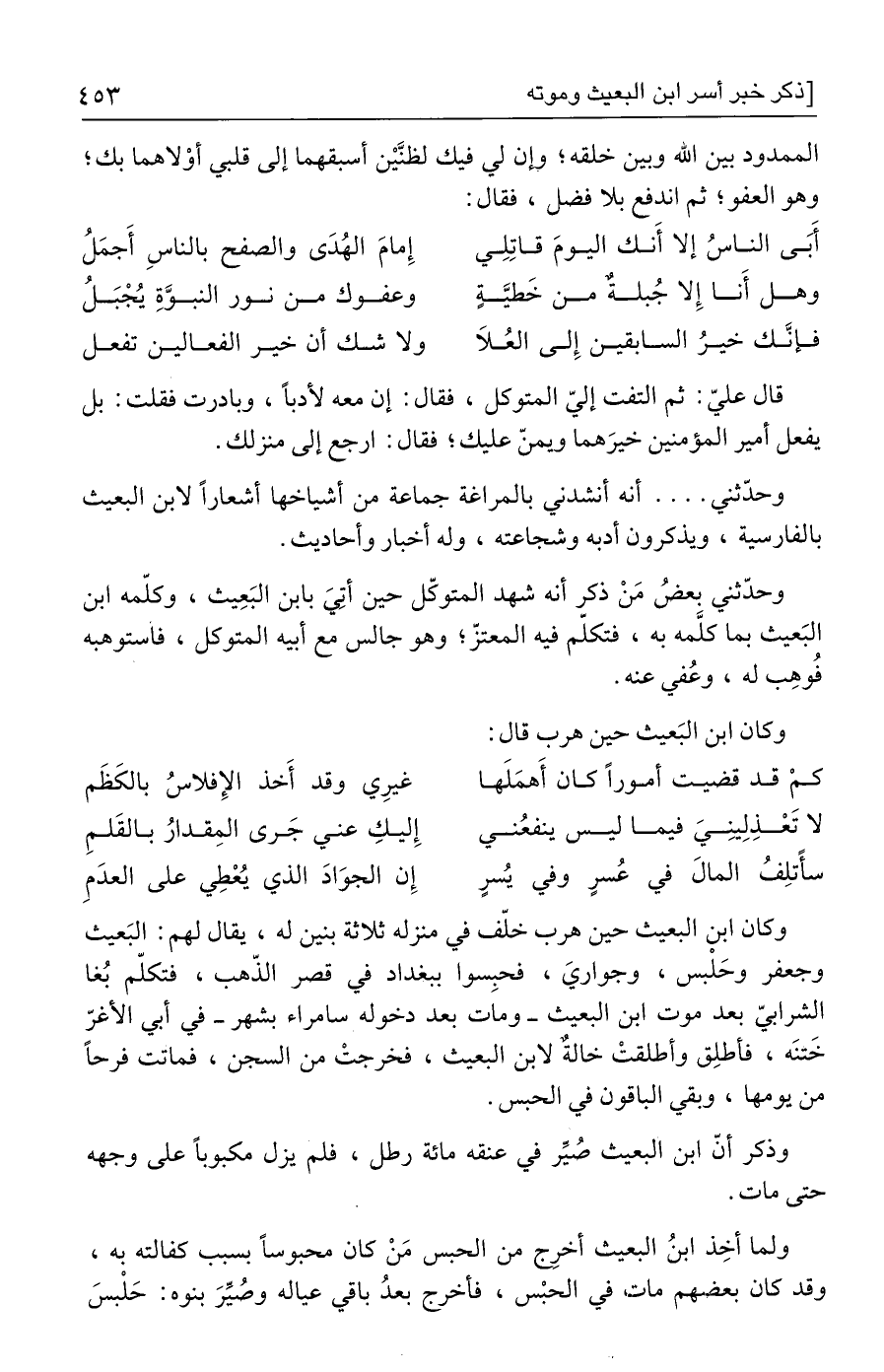 قال عليّ: ثم التفت إليّ المتوكل، فقال: إن معه لأدبًا، وبادرت فقلت: بل يفعل أمير المؤمنين خيرَهما ويمنّ عليك؛ فقال: ارجع إلى منزلك.