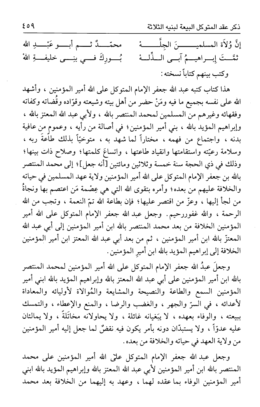 هذا كتاب كتبه عبد الله جعفر الإمام المتوكل على الله أمير المؤمنين، وأشهد الله على نفسه بجميع ما فيه ومَنْ حضر من أهل بيته وشيعته وقوّاده وقُضاته وكفاته وفقهائه وغيرهم من المسلمين لمحمد المنتصر بالله، ولأبي عبد الله المعتز بالله، وإبراهيم المؤيد بالله، بني أمير المؤمنين؛ في أصالة من رأيه، وعموم من عافية بدنه، واجتماع من فهمه، مختارًا لما شهد به، متوخيًّا بذلك طاعةَ ربه، وسلامة رعيّته واستقامتها وانقياد طاعتها، واتساعَ كلمتها؛ وصلاح ذات بينها؛ وذلك في ذي الحجة سنة خمسة وثلاثين ومائتين [أنه جعل]؛ إلى محمد المنتصر بالله بن جعفر الإمام المتوكل على الله أمير المؤمنين ولاية عهد المسلمين في حياته والخلافة عليهم من بعده؛ وأمره بتقوى الله التي هي عِصْمة مَن اعتصم بها ونجاةُ من لجأ إليها، وعزّ من اقتصر عليها؛ فإن بطاعة الله تمّ النعمة، وتجب من الله الرحمة، والله غفور رحيم. وجعل عبد الله جعفر الإمام المتوكل على الله أمير المؤمنين الخلافة من بعد محمد المنتصر بالله ابن أمير المؤمنين إلى أبي عبد الله المعتز بالله ابن أمير المؤمنين، ثم من بعد أبي عبد الله المعتز ابن أمير المؤمنين الخلافة إلى إبراهيم المؤيد بالله ابن أميرِ المؤمنين.
