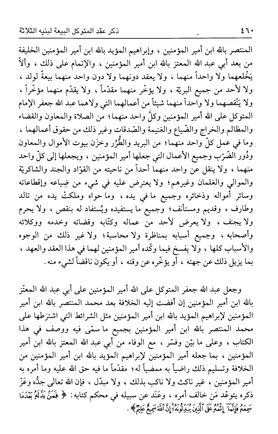 وجعل عبد الله جعفر المتوكل على الله أمير المؤمنين على أبي عبد الله المعتّز بالله ابن أمير المؤمنين إن أفضت إليه الخلافة بعد محمد المنتصر بالله ابن أمير المؤمنين لإبراهيم المؤيد بالله ابن أمير المؤمنين مثل الشرائط التي اشترَطها على محمد المنتصر بالله ابن أمير المؤمنين بجميع ما سمّى فيه ووصف في هذا الكتاب، وعلى ما بيّن وفسّر، مع الوفاء من أبي عبد الله المعتز بالله ابن أمير المؤمنين، بما جعله أمير المؤمنين لإبراهيم المؤيد بالله ابن أمير المؤمنين من الخلافة وتسليم ذلك راضيًا به ممضيًا له؛ مقدّمًا ما فيه حق الله عليه وما أمره به أمير المؤمنين، غير ناكث ولا ناكب بذلك، ولا مبدّل، فإن الله تعالى جدُّه وعَزّ ذكره يتوعّد مَن خالف أمره، وعَنَد عن سبيله في محكم كتابه: {فَمَنْ بَدَّلَهُ بَعْدَ مَا سَمِعَهُ فَإِنَّمَا إِثْمُهُ عَلَى الَّذِينَ يُبَدِّلُونَهُ إِنَّ اللَّهَ سَمِيعٌ عَلِيمٌ}.
