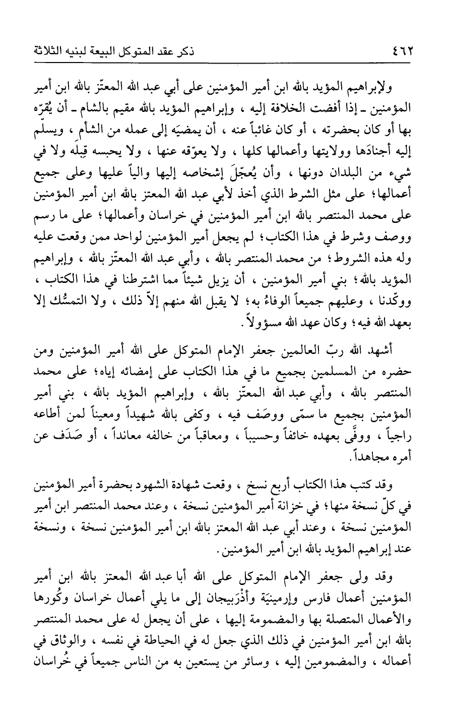 أشهد الله ربّ العالمين جعفر الإمام المتوكل على الله أمير المؤمنين ومن حضره من المسلمين بجميع ما في هذا الكتاب على إمضائه إياه؛ على محمد المنتصر بالله، وأبي عبد الله المعتّز بالله، وإبراهيم المؤيد بالله، بني أمير المؤمنين بجميع ما سمّى ووصَف فيه، وكفى بالله شهيدًا ومعينًا لمن أطاعه راجيًا، ووفَّى بعهده خائفًا وحسيبًا، ومعاقبًا من خالفه معاندًا، أو صَدَف عن أمره مجاهدًا.