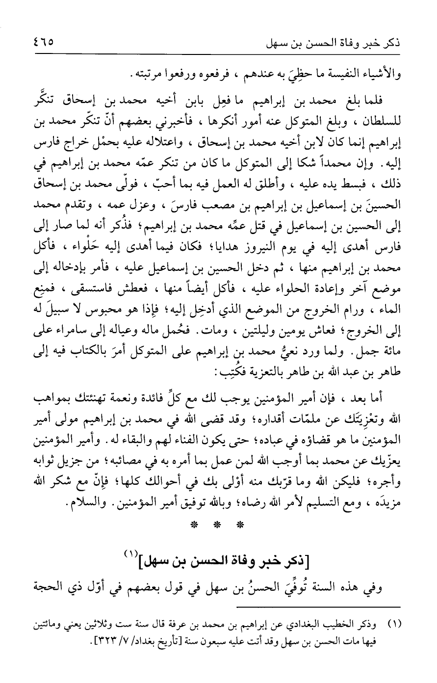 أما بعد، فإن أمير المؤمنين يوجب لك مع كلِّ فائدة ونعمة تهنئتك بمواهب الله وتعْزِيَتَك عن ملمّات أقداره؛ وقد قضى الله في محمد بن إبراهيم مولى أمير المؤمنين ما هو قضاؤه في عباده؛ حتى يكون الفناء لهم والبقاء له. وأمير المؤمنين يعزّيك عن محمد بما أوجب الله لمن عمل بما أمره به في مصائبه؛ من جزيل ثوابه وأجره؛ فليكن الله وما قرّبك منه أوْلى بك في أحوالك كلها؛ فإِنّ مع شكر الله مزيدَه، ومع التسليم لأمر الله رضاه؛ وبالله توفيق أمير المؤمنين. والسلام.