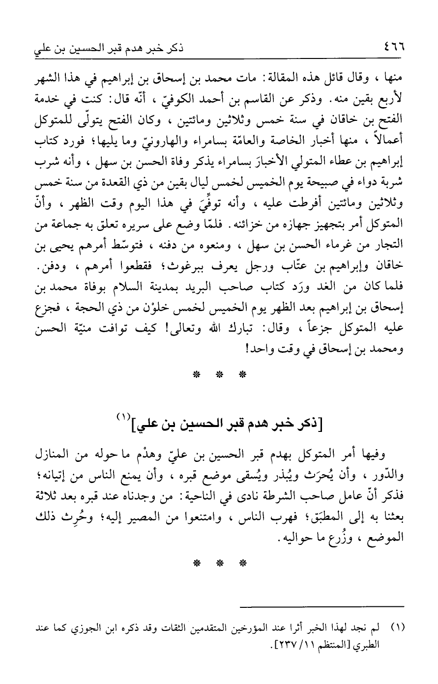 منها، وقال قائل هذه المقالة: مات محمد بن إسحاق بن إبراهيم في هذا الشهر لأربع بقين منه. وذكر عن القاسم بن أحمد الكوفيّ، أنّه قال: كنت في خدمة الفتح بن خاقان في سنة خمس وثلاثين ومائتين، وكان الفتح يتولّى للمتوكل أعمالًا، منها أخبار الخاصة والعامّة بسامراء والهارونيّ وما يليها؛ فورد كتاب إبراهيم بن عطاء المتولي الأخبارَ بسامراء يذكر وفاة الحسن بن سهل، وأنه شرب شربة دواء في صبيحة يوم الخميس لخمس ليال بقين من ذي القعدة من سنة خمس وثلاثين ومائتين أفرطت عليه، وأنه توفِّيَ في هذا اليوم وقت الظهر، وأنّ المتوكل أمر بتجهيز جهازه من خزائنه. فلمّا وضع على سريره تعلق به جماعة من التجار من غرماء الحسن بن سهل، ومنعوه من دفنه، فتوسّط أمرهم يحيى بن خاقان وإبراهيم بن عتّاب ورجل يعرف ببرغوث؛ فقطعوا أمرهم، ودفن. فلما كان من الغد ورَد كتاب صاحب البريد بمدينة السلام بوفاة محمد بن إسحاق بن إبراهيم بعد الظهر يوم الخميس لخمس خلوْن من ذي الحجة، فجزع عليه المتوكل جزعًا، وقال: تبارك الله وتعالى! كيف توافت منيّة الحسن ومحمد بن إسحاق في وقت واحد!