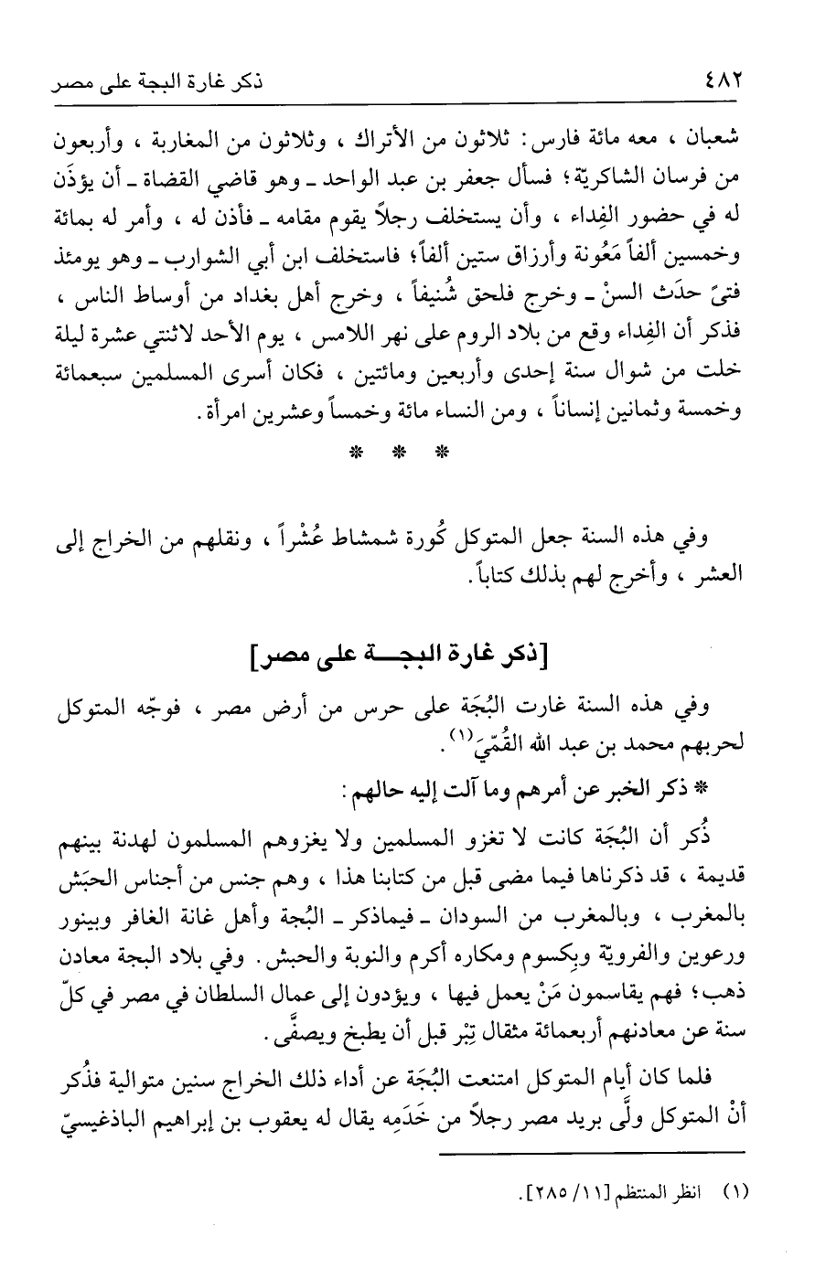 ذُكر أن البُجَة كانت لا تغزو المسلمين ولا يغزوهم المسلمون لهدنة بينهم قديمة، قد ذكرناها فيما مضى قبل من كتابنا هذا، وهم جنس من أجناس الحبَش بالمغرب، وبالمغرب من السودان - فيما ذكر - البُجة وأهل غانة الغافر وبينور ورعوين والفرويّة وبِكسوم ومكاره أكرم والنوبة والحبش. وفي بلاد البجة معادن ذهب؛ فهم يقاسمون مَنْ يعمل فيها، ويؤدون إلى عمال السلطان في مصر في كلّ سنة عن معادنهم أربعمائة مثقال تِبْر قبل أن يطبخ ويصفَّى.