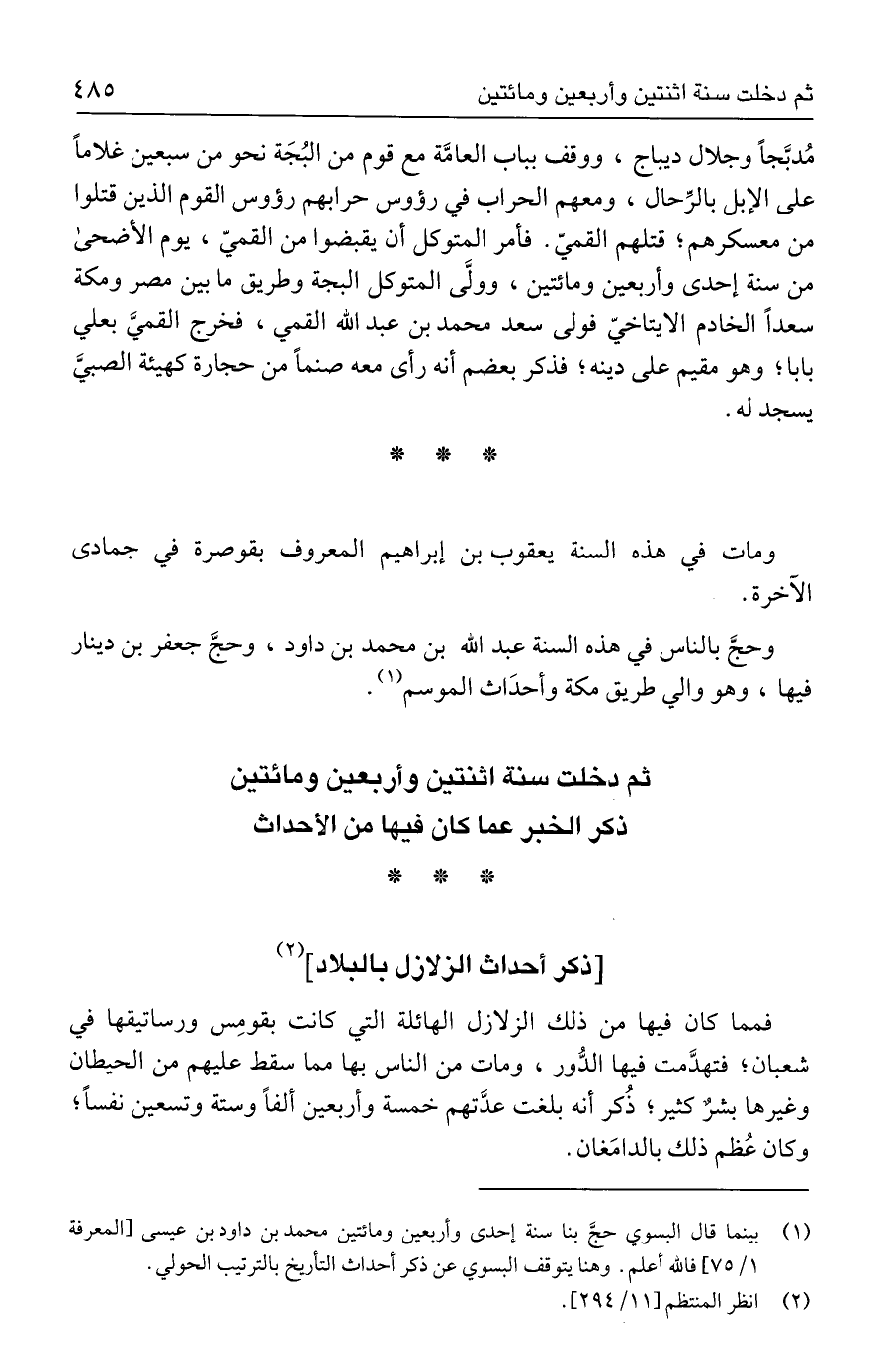 فمما كان فيها من ذلك الزلازل الهائلة التي كانت بقومِس ورساتيقها في شعبان؛ فتهدَّمت فيها الدُّور، ومات من الناس بها مما سقط عليهم من الحيطان وغيرها بشرٌ كثير؛ ذُكر أنه بلغت عدَّتهم خمسة وأربعين ألفًا وستة وتسعين نفسًا؛ وكان عُظم ذلك بالدامَغان.