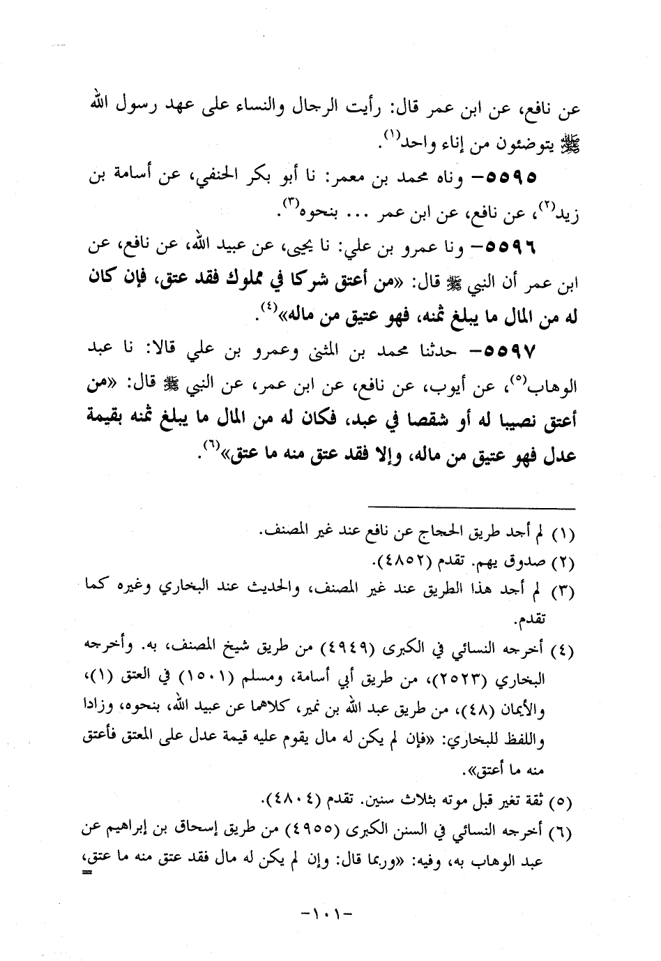 5597- حَدَّثنا مُحَمَّدُ بْنَ الْمُثَنَّى وَعَمْرُو بْنُ عَلِيٍّ، قالاَ: حَدَّثنا عَبد الوَهَّاب، عَن أَيُّوبَ، عَن نافعٍ، عَن ابْنِ عُمَر، عَن النَّبِيّ صَلَّى اللَّهُ عَلَيه وَسَلَّم قَالَ: مَنْ أَعْتَقَ نَصِيبًا لَهُ، أَوْ شِقْصًا فِي عَبد فَكَانَ لَهُ مِنَ الْمَالِ مَا يَبْلُغُ ثَمَنَهُ بِقِيمَةِ عَدْلٍ فَهُوَ عَتِيقٌ مِنْ مَالِهِ وَإِلا فَقَدْ عَتَقَ مِنْهُ ما عتق.