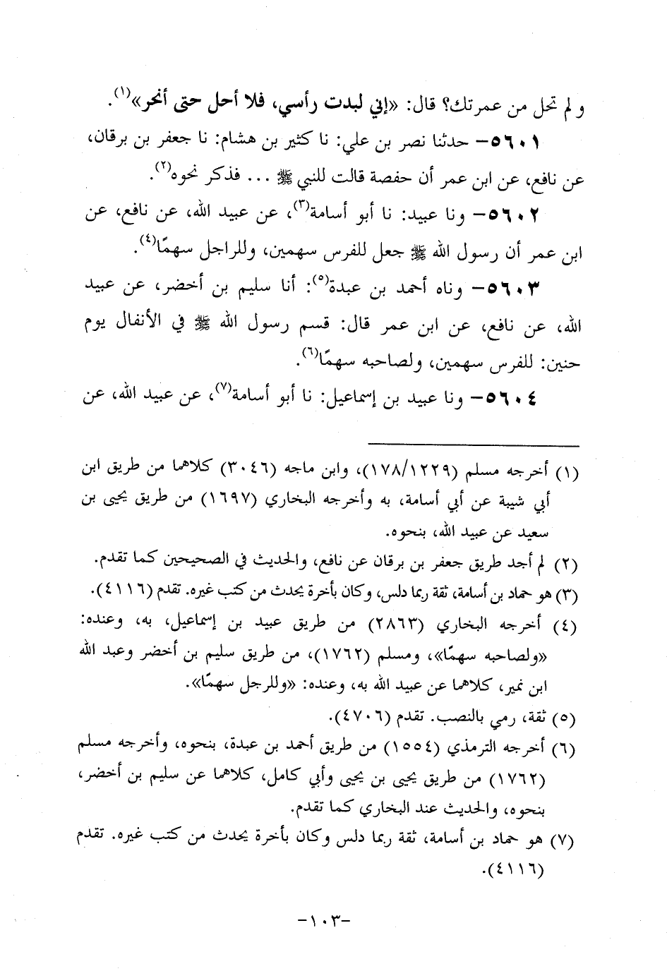 5603- وحَدَّثناه أحمد بن عَبدة: أَخْبَرَنَا سُلَيْمُ بْنُ أَخْضَرَ، عَن عُبَيد اللَّهِ، عَن نافعٍ، عَن ابْنِ عُمَر قَالَ: قَسَمَ رَسُولُ اللَّهِ صَلَّى اللَّهُ عَلَيه وَسَلَّم فِي الأَنْفَالِ يوم حنين: للفرس سهمين ولصاحبه سهما.