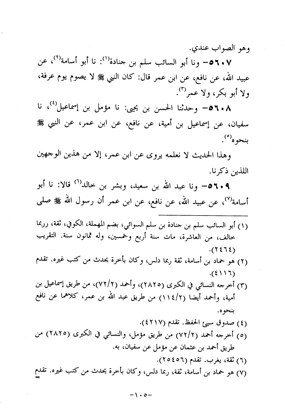 5607- وحَدَّثنا أَبُو السائب سَلْم بن جُنَادَةَ، حَدَّثنا أَبُو أُسَامة، عَن عُبَيد اللَّهِ، عَن نافعٍ، عَن ابْنِ عُمَر قَالَ: كَانَ النَّبِيّ صَلَّى اللَّهُ عَلَيه وَسَلَّم لا يَصُومُ يَوْمَ عَرَفَةَ، ولاَ أَبُو بَكْرٍ، ولاَ عُمَرُ.