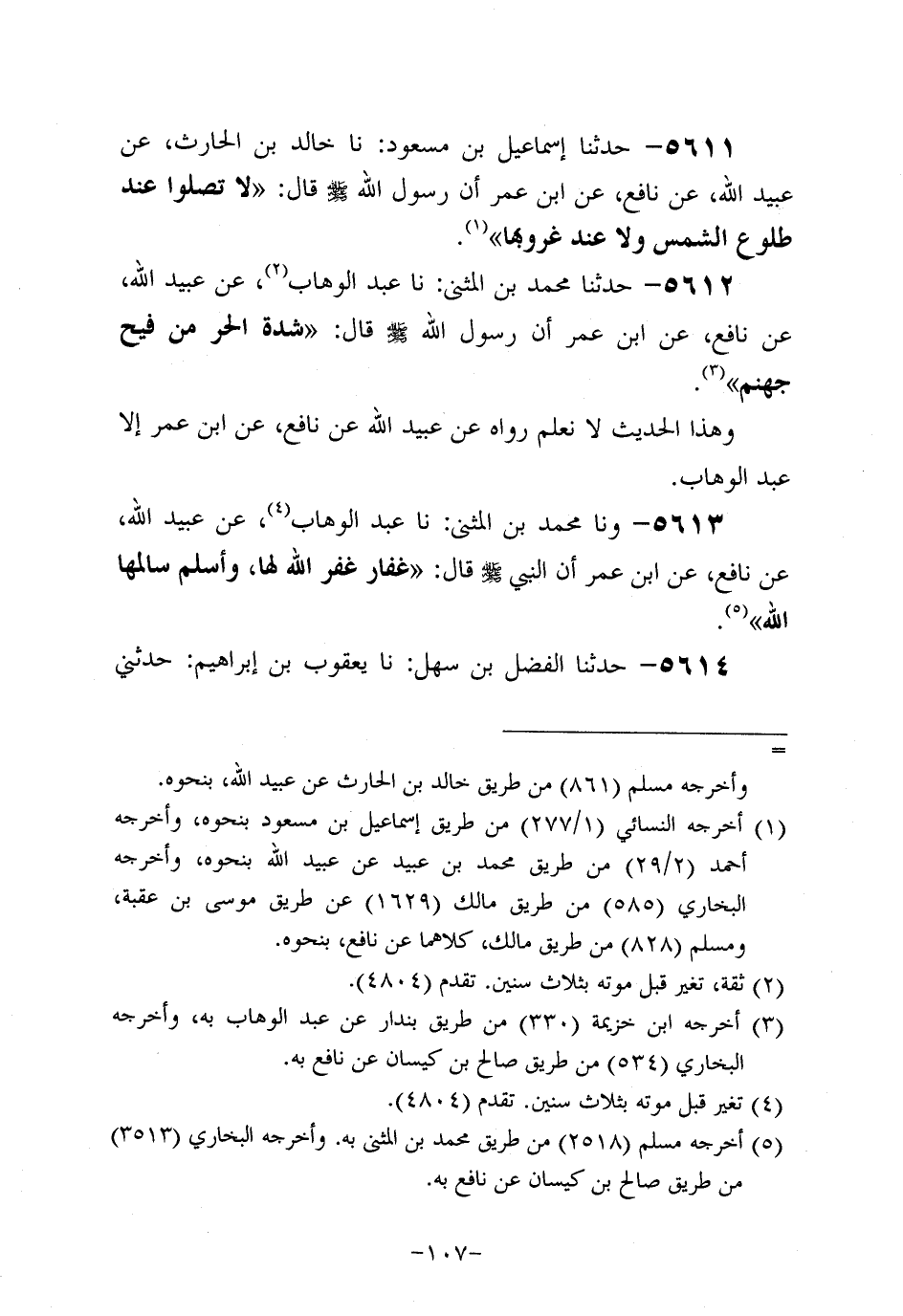 5611- حَدَّثنا إسماعيل بن مسعود، حَدَّثنا خَالِدُ بْنُ الْحَارِثِ، عَن عُبَيد اللَّهِ، عَن نافعٍ، عَن ابْنِ عُمَر؛ أَن رَسولَ اللهِ صَلَّى اللَّهُ عَلَيه وَسَلَّم، قَال: لاَ تُصَلُّوا عِنْدَ طُلُوعِ الشَّمْسِ، ولاَ عِنْدَ غُرُوبِهَا.