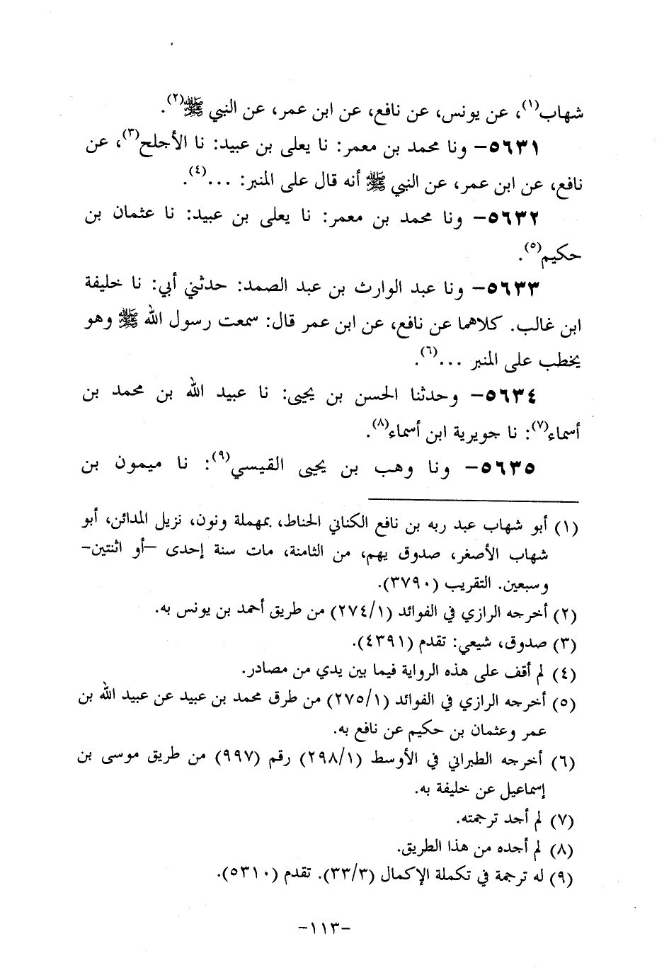 5631- وحَدَّثنا مُحَمد بن مَعْمَر، حَدَّثنا يَعْلَى بن عُبَيد، حَدَّثنا الأَجْلَحُ، عَن نافعٍ، عَن ابْنِ عُمَر، عَن النَّبِيّ صَلَّى اللَّهُ عَلَيه وَسَلَّم؛ أَنَّه قَالَ على المنبر: (ح)