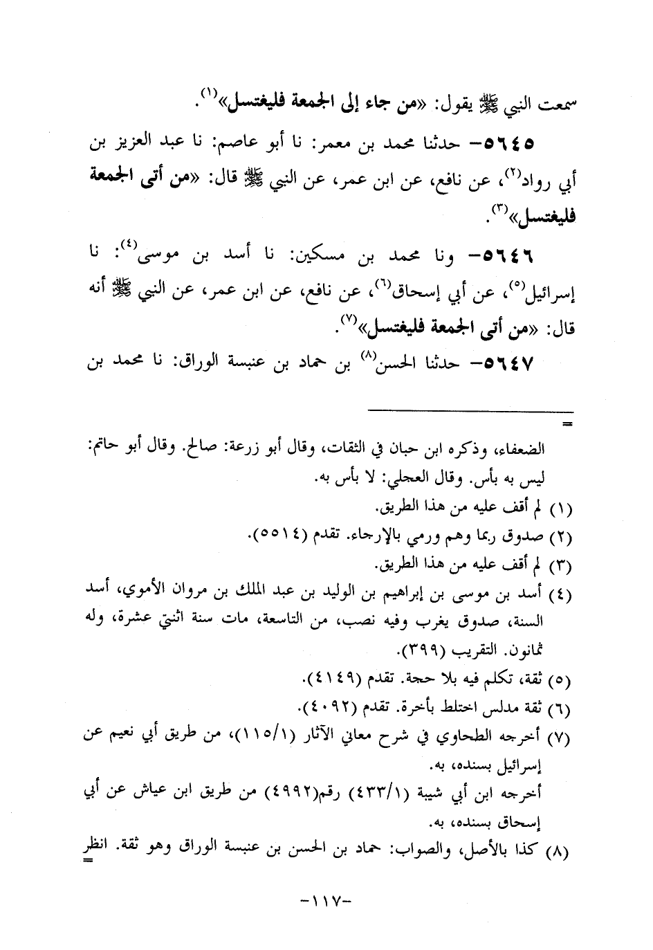 5646- وحَدَّثنا مُحَمد بْنُ مِسْكِينٍ، حَدَّثنا أَسَدُ بْنُ موسى، حَدَّثنا إِسْرَائِيلُ، عَن أَبِي إِسْحَاقَ، عَن نافعٍ، عَن ابْنِ عُمَر، عَن النَّبِيّ صَلَّى اللَّهُ عَلَيه وَسَلَّم؛ أَنَّه قَالَ: مَنْ أَتَى الْجُمْعَةَ فَلْيَغْتَسِلْ.
