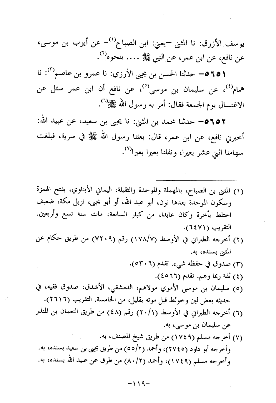 5651- حَدَّثنا الحسن بن يَحْيَى الأرزي، حَدَّثنا عَمْرو بن عَاصِم، حَدَّثنا هَمَّامٌ، عَن سُلَيْمَانَ بْنِ مُوسَى، عَن نافعٍ أَنَّ ابْنَ عُمَر سُئل عَن الاغْتِسَالِ يَوْمَ الْجُمْعَةِ فَقَالَ: أَمَرَ بِهِ رَسُولُ اللَّهِ صَلَّى اللَّهُ عَلَيه وَسَلَّم.