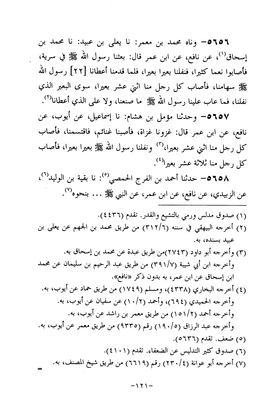 5656- وحَدَّثناه مُحَمد بن مَعْمَر، حَدَّثنا يَعْلَى بن عُبَيد، حَدَّثنا مُحَمد بْنُ إِسْحَاقَ، عَن نافعٍ، عَن ابِن عُمَر قَالَ: بَعَثَنَا رَسُولُ اللَّهِ صَلَّى اللَّهُ عَلَيه وَسَلَّم فِي سَرِيَّةٍ فَأَصَابُوا نَعَمًا كَثِيرًا فَنُفِّلْنَا بَعِيرًا بَعِيرًا فَلَمَّا قَدِمْنَا أَعْطَانَا رَسُولُ اللَّهِ صَلَّى اللَّهُ عَلَيه وَسَلَّم سِهَامَنَا فَأَصَابَ كُلُّ رَجُلٍ مِنَّا اثْنَيْ عَشَرَ بَعِيرًا سِوَى الْبَعِيرِ الَّذِي نَفَّلَنَا فَمَا عَابَ عَلَيْنَا رَسُولُ اللَّهِ صَلَّى اللَّهُ عَلَيه وَسَلَّم مَا صَنَعْنَا، ولاَ عَلَى الَّذِي أَعْطَانَا.