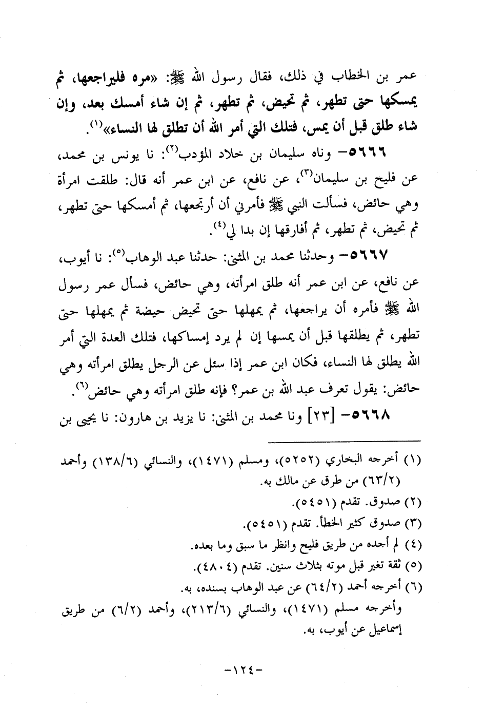 5666- وحَدَّثناه سليمان بن خلاد المؤدب، حَدَّثنا يُونُسُ بْنُ مُحَمد، عَن فُلَيْحِ بْنِ سُلَيْمَانَ، عَن نافعٍ، عَن ابْنِ عُمَر أَنَّهُ قَالَ: طَلَّقْتُ امْرَأَةٌ وَهِيَ حَائِضٌ فَسَأَلْتُ النَّبِيّ صَلَّى اللَّهُ عَلَيه وَسَلَّم فَأَمَرَنِي أَنْ أَرْتَجِعَهَا، ثُمَّ أَمْسِكَهَا حَتَّى تَطْهُرَ، ثُمَّ تَحِيضَ، ثُمَّ تَطْهُرَ، ثُمَّ أُفَارِقَهَا إِنْ بَدَا لِي.