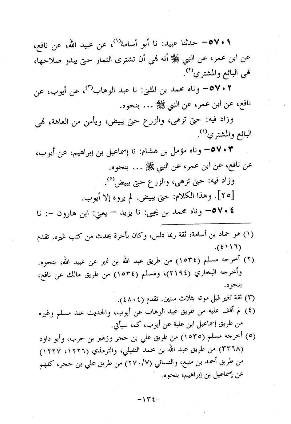 5701- حَدَّثنا عُبَيد، حَدَّثنا أَبُو أُسَامة، عَن عُبَيد اللَّهِ، عَن نافعٍ، عَن ابْنِ عُمَر، عَن النَّبِيّ صَلَّى اللَّهُ عَلَيه وَسَلَّم؛ أَنَّهُ نَهَى أَنْ تُشتَرى الثمارُ، حَتَّى يَبْدُوَ صَلاَحُهَا، نَهَى الْبَائِعَ وَالْمُشْتَرِي.
