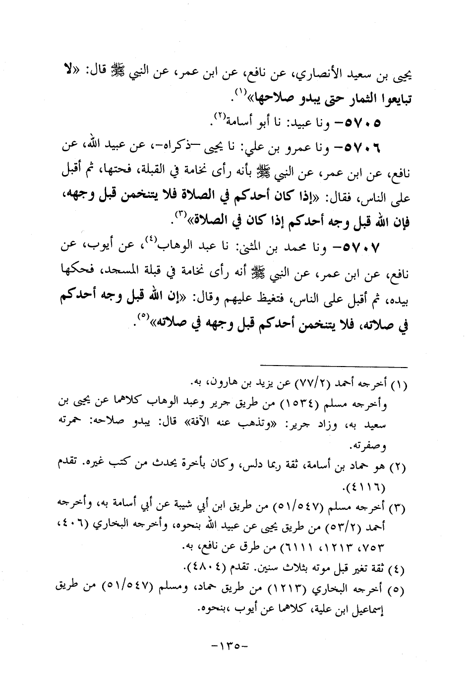 5705 و5706- وحَدَّثنا عُبَيد، حَدَّثنا أَبُو أُسَامة (ح) وحَدَّثَنا عَمْرُو بْنُ عَلِيٍّ، حَدَّثَنا يَحْيَى ذَكَرَاهُ، عَن عُبَيد اللَّهِ، عَن نافعٍ، عَن ابْنِ عُمَر، عَن النَّبِيّ صَلَّى اللَّهُ عَلَيه وَسَلَّم بِأَنَّهُ رَأَى نُخَامَةً فِي الْقِبْلَةِ فَحَتَّهَا، ثُمَّ أَقْبَلَ عَلَى النَّاسِ فَقَالَ: إِذَا كَانَ أَحَدُكُمْ فِي الصَّلاةِ فَلا يَتَنَخَّمَنَّ قِبَلَ وَجْهِهِ فَإِنَّ اللَّهَ قِبَلَ وَجْهِ أَحَدِكُمْ إِذَا كان في الصلاة.