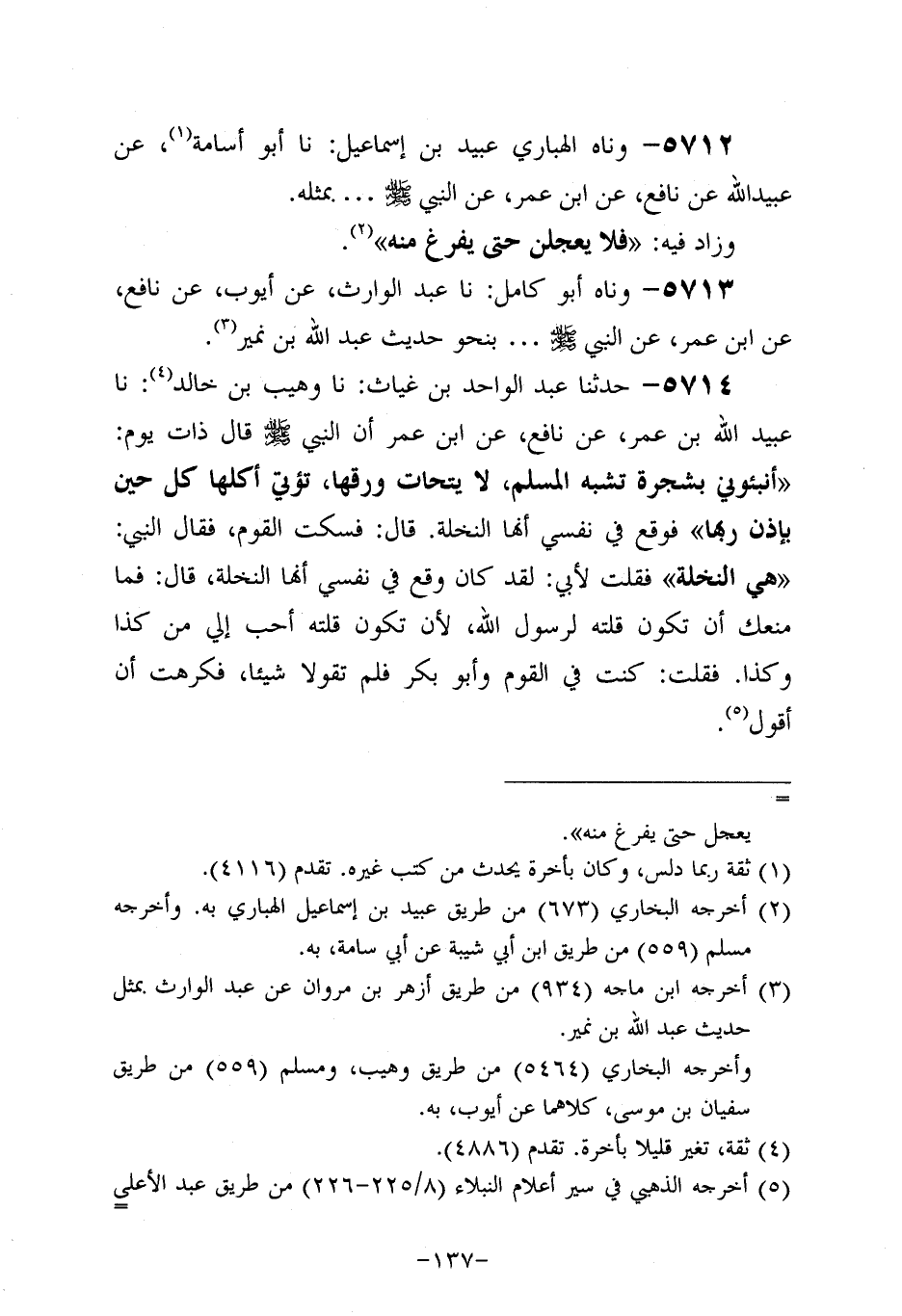 5714- حَدَّثنا عَبد الواحد بن غياث، حَدَّثنا وهيب بن خالد، حَدَّثنا عُبَيد اللَّهِ بْنِ عُمَر، عَن نافعٍ، عَن ابْنِ عُمَر؛ أَن النَّبِيّ صَلَّى اللَّهُ عَلَيه وَسَلَّم قَالَ ذَاتَ يَوْمٍ: أَنْبِئُونِي بِشَجَرَةٍ تُشْبِهُ الْمُسْلِمَ لا يَتَحَاتُّ وَرَقُهَا تُؤْتِي أُكُلَهَا كُلَّ حِينِ بِإِذْنِ رَبِّهَا فَوَقَعَ فِي نَفْسِي أَنَّهَا النَّخْلَةُ. قَالَ: فَسَكَتَ الْقَوْمُ فَقَالَ النَّبِيّ: هِيَ النَّخْلَةُ فَقُلْتُ لأَبِي: لَقَدْ كَانَ وَقَعَ فِي نَفْسِي أَنَّهَا النَّخْلَةُ قَالَ: فَمَا مَنَعَكَ أَنْ تَكُونَ قُلْتَهُ لِرَسُولِ اللَّهِ لأَنْ تَكُونَ قُلْتَهُ أَحَبَّ إِلَيَّ مِنْ كَذَا وَكَذَا فَقُلْتُ: كُنْتَ فِي الْقَوِم، وَأبُو بَكْرٍ فَلَمْ تَقُولا شَيْئًا فَكَرِهْتُ أَن أَقُولَ.