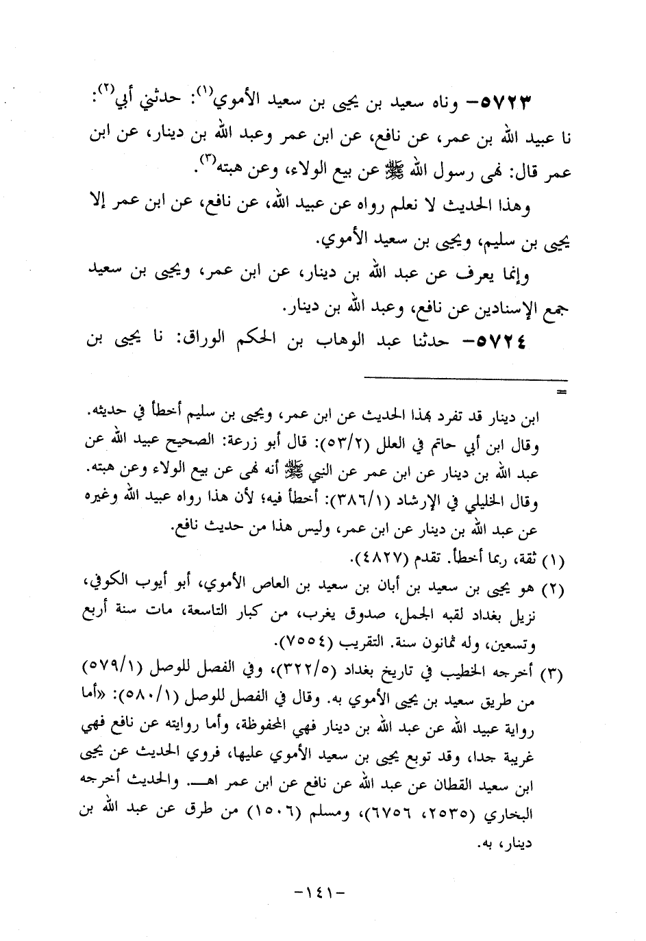 5723- وحَدَّثناه سَعِيد بْنُ يَحْيَى بْنِ سَعِيد الأُمَوي: حَدَّثَنِي أبي، حَدَّثنا عُبَيد اللَّهِ بْنِ عُمَر، عَن نافعٍ، عَن ابْنِ عُمَر، وعَبد اللهِ بْنِ دِينَارٍ، عَن ابْنِ عُمَر قَالَ: نَهَى رَسُولُ اللهِ صَلَّى اللَّهُ عَلَيه وَسَلَّم عَن بَيْعِ الْوَلاءِ، وعَن هِبَتِهِ.