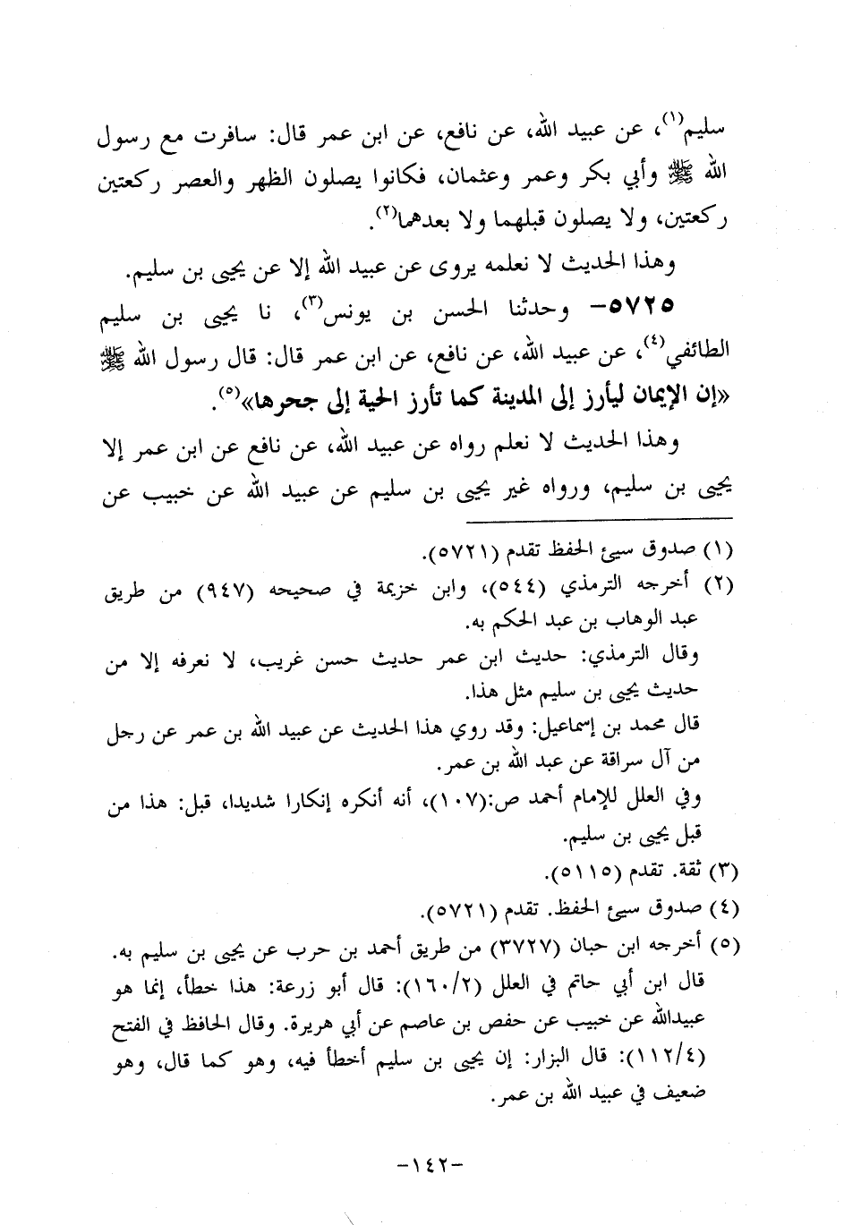 5725- وَحَدَّثَنَا الْحَسَنُ بْنُ يُونُسَ، حَدَّثَنَا يَحْيَى بْنُ سُلَيْمٍ الطَّائِفِيُّ، عَنْ عُبَيْدِ اللهِ، عَنْ نَافِعٍ، عَنِ ابْنِ عُمَرَ، قَالَ: قَالَ رَسُولُ اللهِ صَلَّى اللَّهُ عَلَيْهِ وَسَلَّمَ: إِنَّ الإِيمَانَ لَيَأْرِزُ إِلَى الْمَدِينَةِ، كَمَا تَأْرِزُ الْحَيَّةُ إِلَى جُحْرِهَا.