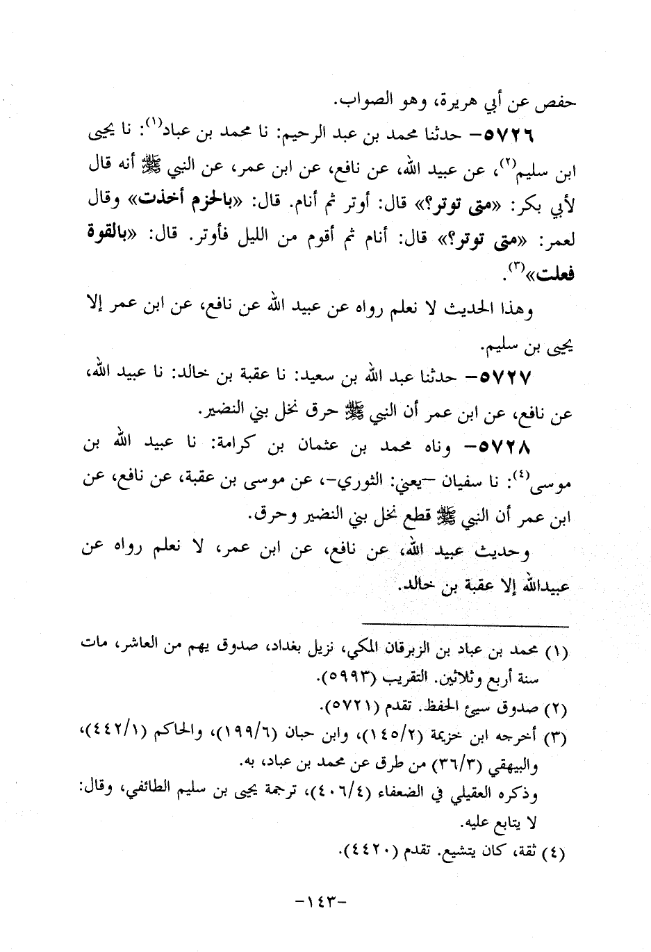 5726- حَدَّثنا مُحَمد بن عَبد الرحيم، حَدَّثنا مُحَمد بن عباد، حَدَّثنا يَحْيَى بْنُ سُلَيْم، عَن عُبَيد اللَّهِ، عَن نافعٍ، عَن ابْنِ عُمَر، عَن النَّبِيّ صَلَّى اللَّهُ عَلَيه وَسَلَّم؛ أَنَّه قَالَ لأَبِي بَكْرٍ: مَتَى تُوتِرُ؟ قَالَ: أُوتِرُ، ثُمَّ أَنَامُ قَالَ: بِالْحَزْمِ أَخَذْتَ، وَقال لِعُمَرَ: مَتَى تُوتِرُ؟ قَالَ: أَنَامُ، ثُمَّ أَقُومُ مِنَ اللَّيْلِ فَأُوتِرُ. قَالَ: بِالْقُوَّةِ فَعَلْتَ.