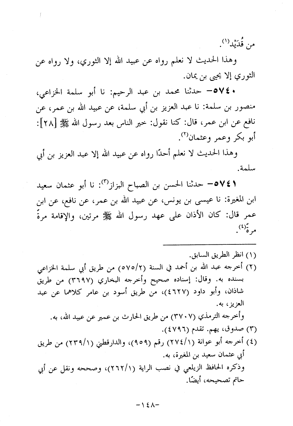5741- حَدَّثنا الحسن بن الصباح البزاز، حَدَّثنا أَبُو عُثمَان سَعِيد بن المغيرة، حَدَّثنا عِيسَى بْنُ يُونُسَ، عَن عُبَيد اللَّهِ بْنِ عُمَر، عَن نافعٍ، عَن ابْنِ عُمَر قَالَ: كَانَ الأَذَانُ عَلَى عَهْدِ رَسُولِ اللَّهِ صَلَّى اللَّهُ عَلَيه وَسَلَّم مَرَّتَيْنِ وَالإِقَامَةُ مَرَّةً مَرَّةً.