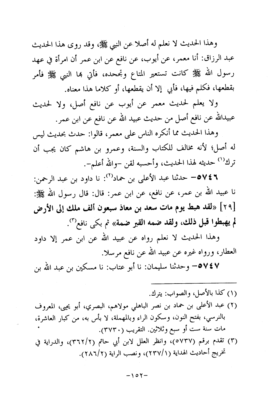 5747 - وحَدَّثنا سليمان، حَدَّثنا أَبُو عتاب، حَدَّثنا مسكين بن عَبد اللَّهِ بْنِ عَبد الرَّحْمَنِ بْنِ زَيْدِ بْنِ الْخَطَّابِ: أَخْبَرَنِي نَافِعٍ، عَن ابْنِ عُمَر قَالَ: قَالَ رَسُول اللهِ صَلَّى اللَّهُ عَلَيه وَسَلَّم: لَقَدْ نَزَلَ لِمَوْتِ سَعْد بْنِ مُعَاذٍ سبعون ألف ملك ما وطؤُوا الأَرْضَ قَبْلَهَا، وَقال حِينَ دُفِنَ: سُبْحَانَ اللَّهِ!! لَوِ انْفَلَتَ أَحَدٌ مِنْ ضَغْطَةِ الْقَبْرِ لانْفَلَتَ منها سعد.