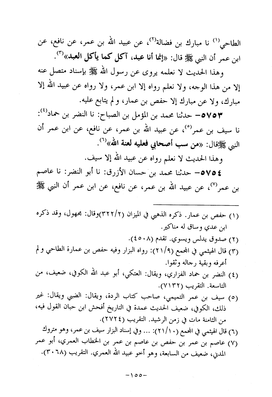 5753- حَدَّثنا مُحَمد بن المؤمل بن الصباح، حَدَّثنا النضر بن حماد، حَدَّثنا سَيْفُ بْنُ عُمَر، عَن عُبَيد اللَّهِ بْنِ عُمَر، عَن نافعٍ، عَن ابْنِ عُمَر؛ أَن النَّبِيّ صَلَّى اللَّهُ عَلَيه وَسَلَّم قَالَ: مَنْ سَبَّ أَصْحَابِي فَعَلَيْهِ لَعْنَةُ اللَّهِ.