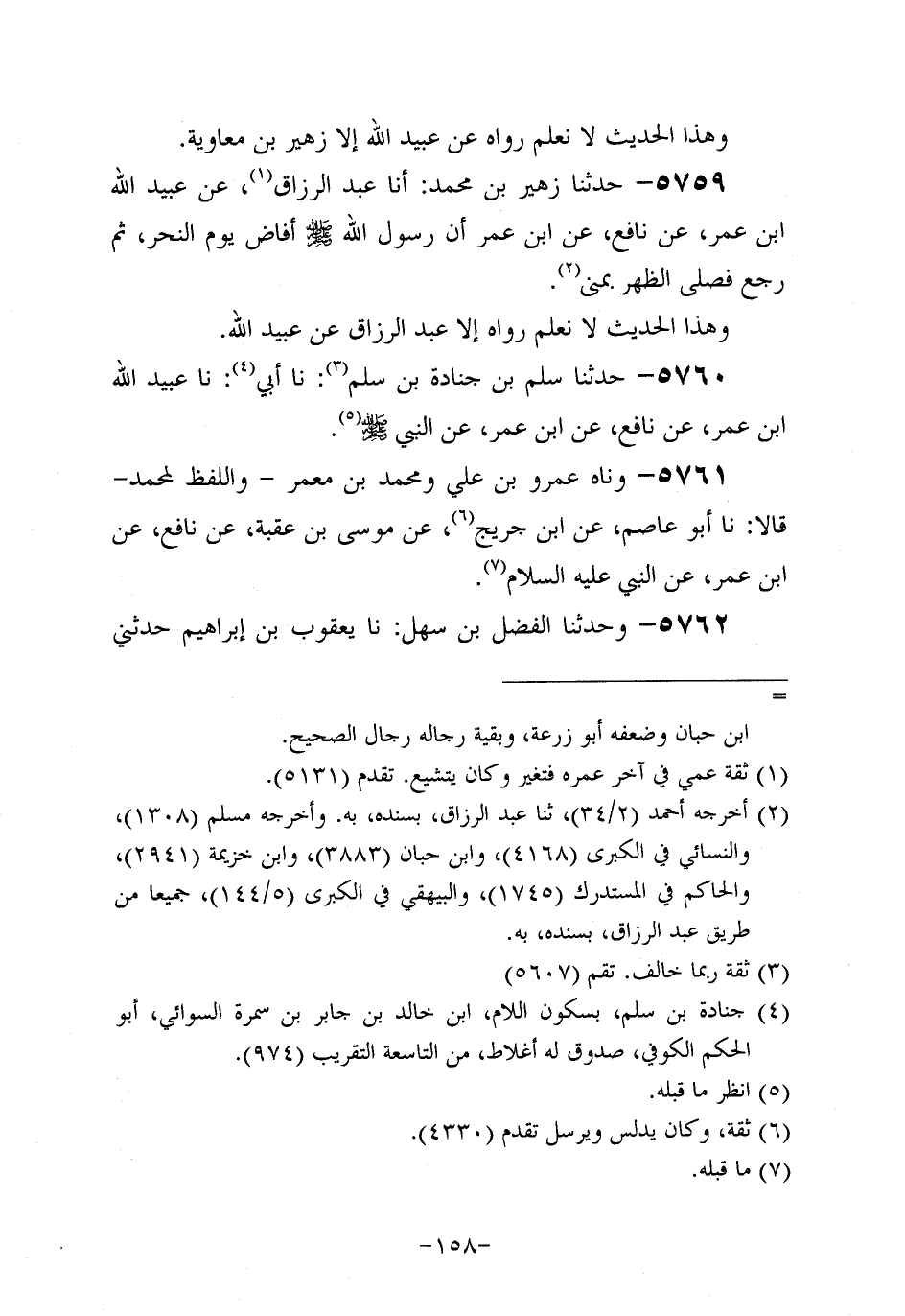 5759- حَدَّثنا زهير بن مُحَمد، أخبرَنا عَبد الرَّزَّاق، عَن عُبَيد اللَّهِ بْنِ عُمَر، عَن نافعٍ، عَن ابْنِ عُمَر؛ أَن رَسولَ اللهِ صَلَّى اللَّهُ عَلَيه وَسَلَّم أَفَاضَ يَوْمَ النَّحْرِ، ثُمَّ رَجَعَ فَصَلَّى الظُّهْرَ بِمِنًى.