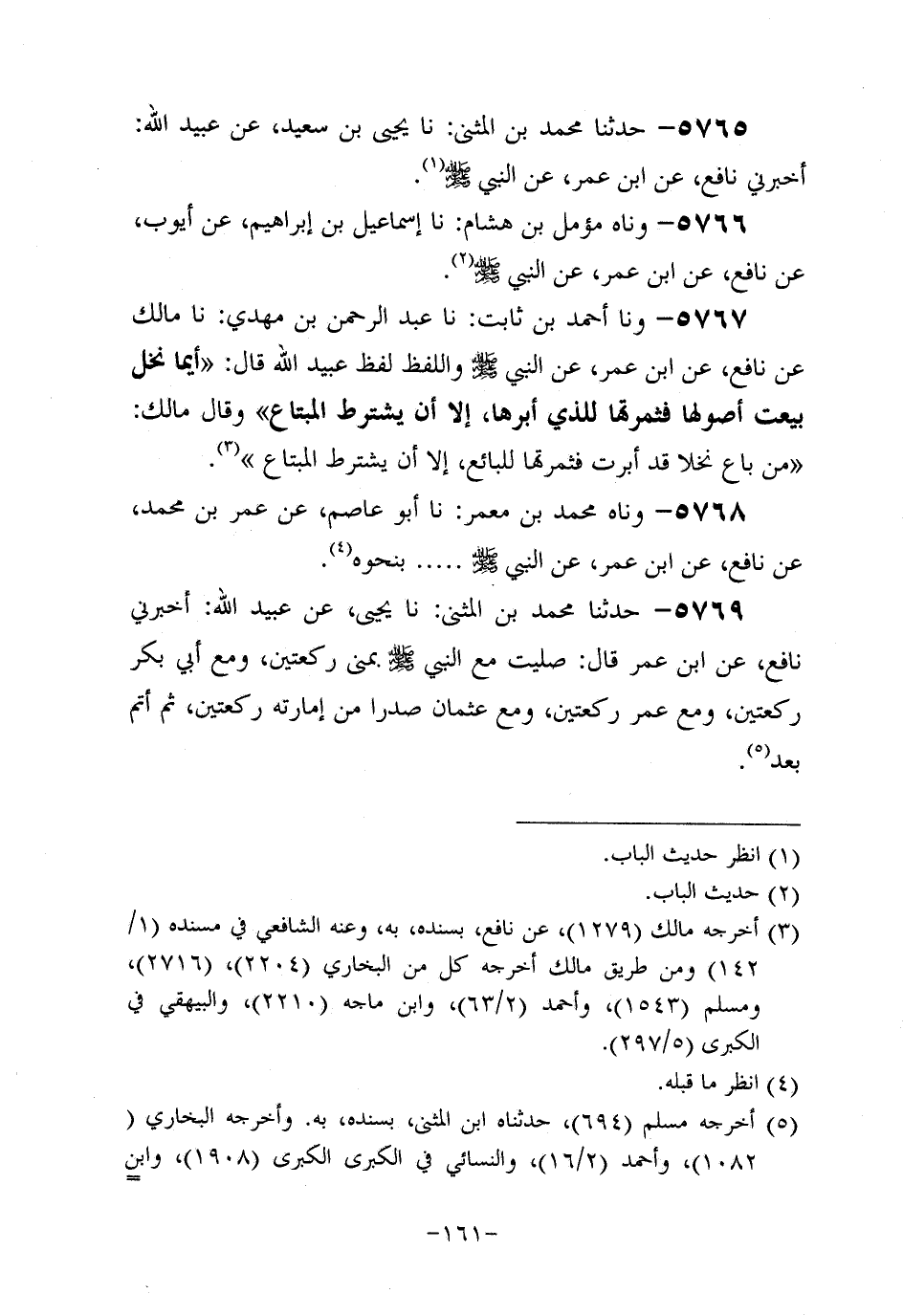 5765- حَدَّثنا مُحَمَّدُ بْنَ الْمُثَنَّى، حَدَّثنا يَحْيَى بْنُ سَعِيد، عَن عُبَيد اللَّهِ: أَخْبَرَنِي نَافِعٍ، عَن ابْنِ عُمَر، عَن النَّبِيّ صَلَّى الله عَليْهِ وَسَلَّمَ.