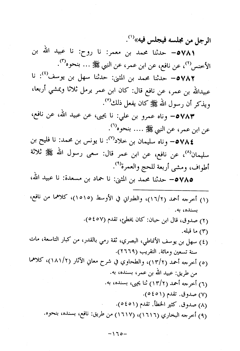 5782- حَدَّثنا مُحَمَّدُ بْنَ الْمُثَنَّى: حَدَّثنا سَهْل بْنُ يوسف، حَدَّثنا عُبَيد اللَّهِ بْنِ عُمَر، عَن نافعٍ قَالَ: كَانَ ابْنُ عُمَر يَرْمُلُ ثَلاثًا وَيَمْشِيِ أَرْبَعًا وَيَذْكُرُ أَنَّ رَسُولَ اللهِ صَلَّى اللَّهُ عَلَيه وَسَلَّم كان يفعل ذلك.