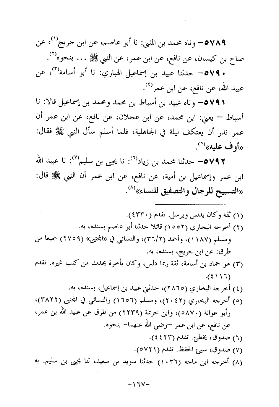5792- حَدَّثنا مُحَمد بن زياد، حَدَّثنا يَحْيَى بن سُلَيْم، حَدَّثنا عُبَيد اللَّهِ بْنِ عُمَر، وإِسْمَاعِيل بْنُ أُمَيَّة، عَن نافعٍ، عَن ابْنِ عُمَر؛ أَن النَّبِيّ صَلَّى اللَّهُ عَلَيه وَسَلَّم قَالَ: التَّسْبِيحُ لِلرِّجَالِ، وَالتَّصْفِيقُ لِلنِّسَاءِ.