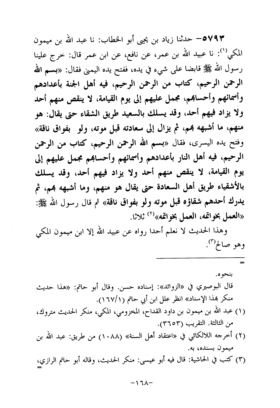 5793- حَدَّثنا زياد بن يَحْيَى أَبُو الخطاب، حَدَّثنا عَبد الله بن ميمون المكي، حَدَّثنا عُبَيد اللَّهِ بْنِ عُمَر، عَن نافعٍ، عَن ابْنِ عُمَر قَالَ: خَرَجَ عَلَيْنَا رَسُولُ اللَّهِ صَلَّى اللَّهُ عَلَيه وَسَلَّم قَابِضًا عَلَى شَيْءٍ فِي يَدِهِ فَفَتَحَ يَدَهُ الْيُمْنَى فَقَالَ: بِسْمِ اللَّهِ الرَّحْمَنِ الرَّحِيمِ كِتَابٌ مِنَ الرَّحْمَنِ الرَّحِيمِ فِيهِ أَهْلُ الْجَنَّةِ بِأَعْدَادِهِمْ وَأَسْمَائِهِمْ وَأَحْسَابِهِمْ مُجْمَلٌ عَلَيْهِمْ إِلَى يَوْمِ الْقِيَامَةِ لا يَنْقُصُ مِنْهُمْ أَحَدٌ، ولاَ يُزَادُ فِيهِمْ أَحَدٌ وَقَدْ يُسْلَكُ بِالسَّعِيدِ طَرِيقَ الشَّقَاءِ حَتَّى يُقَالَ: هُوَ مِنْهُمْ مَا أَشْبَهَهُ بِهِمْ، ثُمَّ يَزَالُ إِلَى سَعَادَتِهِ قَبْلَ مَوْتِهِ، وَلَوْ بِفُوَاقِ نَاقَةٍ، وَفَتَحَ يَدَهُ الْيُسْرَى فَقَالَ بِسْمِ اللَّهِ الرَّحْمَنِ الرَّحِيمِ كِتَابٌ مِنَ الرَّحْمَنِ الرَّحِيمِ فِيهِ أَهْلُ النَّارِ بِأَعْدَادِهِمْ وَأَسْمَائِهِمْ وَأَحْسَابِهِمْ مُجْمَلٌ عَلَيْهِمْ إِلَى يَوْمِ الْقِيَامَةِ لا يَنْقُصُ مِنْهُمْ أَحَدٌ، ولاَ يُزَادُ فِيهِمْ أَحَدٌ وَقَدْ يُسْلَكُ بِالأَشْقِيَاءِ طَرِيقَ أَهْلِ السَّعَادَةِ حَتَّى يُقَالَ هُوَ مِنْهُمْ وَمَا أَشْبَهَهُ بِهِمْ، ثُمَّ يدرك أحدهم شقاؤه قَبْلَ مَوْتِهِ، وَلَوْ بِفُوَاقِ نَاقَةٍ، ثُمَّ قَالَ رَسُول اللهِ صَلَّى اللَّهُ عَلَيه وَسَلَّم: الْعَمَلُ بِخَوَاتِمِهِ الْعَمَلُ بِخَوَاتِمِهِ ثَلاَثًا.