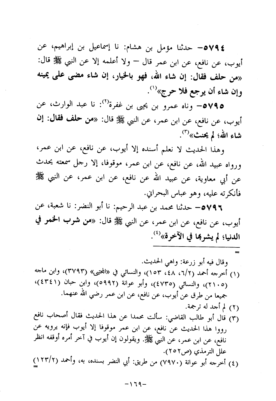 5794- حَدَّثنا مُؤَمَّل بن هشام , حَدَّثنا إِسْمَاعِيلُ بْنُ إِبْرَاهِيمَ، عَن أَيُّوبَ، عَن نافعٍ، عَن ابْنِ عُمَر قَالَ، ولاَ أَعْلَمُهُ إلاَّ، عَن النَّبِيّ صَلَّى اللَّهُ عَلَيه وَسَلَّم قَالَ: مَنْ حَلَفَ فَقَالَ: إِنْ شَاءَ اللَّهُ فَهُوَ بِالْخِيَارِ إِنْ شَاءَ مَضَى عَلَى يَمِينِهِ، وَإن شاء أن يرجع فلا حرج.