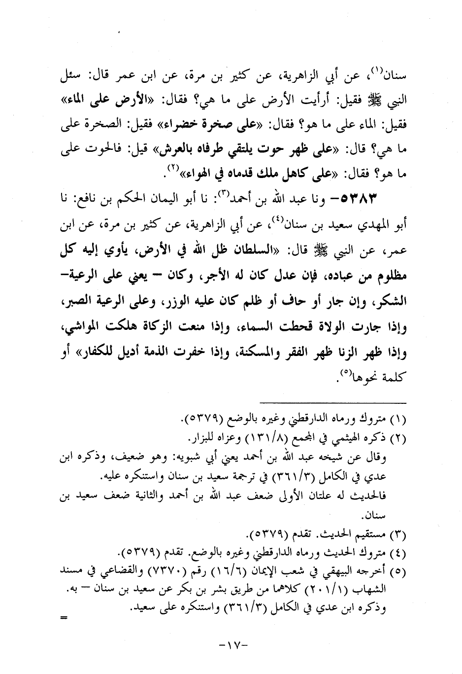 5383- وحَدَّثنا عَبد الله بن أحمد، حَدَّثنا أَبُو اليمان الحكم بن نافع، حَدَّثنا أَبُو الْمَهْدِيِّ سَعِيد بْنُ سِنَانٍ، عَن أَبِي الزَّاهِرِيَّةِ، عَن كَثِيرِ بْنِ مُرَّةَ، عَن ابْنِ عُمَر، عَن النَّبِيّ صَلَّى اللَّهُ عَلَيه وَسَلَّم قَالَ: السُّلْطَانُ ظِلُّ اللَّهِ فِي الأَرْضِ يَأْوِي إِلَيْهِ كُلُّ مَظْلُومٍ مِنْ عِبَادِهِ فَإِنْ عَدَلَ كَانَ لَهُ الأَجْرُ، وَكان يَعْنِي عَلَى الرَّعِيَّةِ الشُّكْرُ، وَإن جَارَ، أَوْ حَافَ، أَوْ ظَلَمَ كَانَ عَلَيْهِ الْوِزْرُ وَعَلَى الرَّعِيَّةِ الصَّبْرُ، وَإِذَا جَارَتِ الْوُلاةُ قَحَطَتِ السَّمَاءُ، وَإِذَا مُنِعَتِ الزَّكَاةُ هَلَكَتِ الْمَوَاشِي، وَإِذَا ظَهَرَ الزِّنَا ظَهَرَ الْفَقْرُ وَالْمَسْكَنَةُ، وَإِذَا خَفَرَتِ الذِّمَّةُ أُدِيلَ لِلْكُفَّارِ، أَوْ كلمة نحوها.