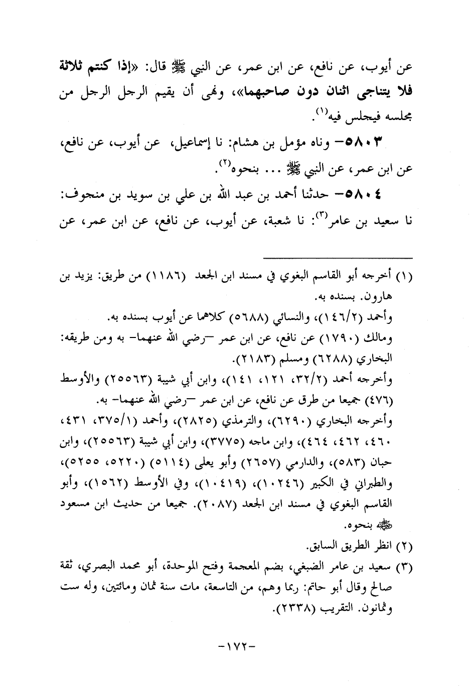 5805- وحَدَّثنا مُؤَمَّل: حَدَّثنا إِسْمَاعِيلُ بْنُ إِبْرَاهِيمَ، عَن أَيُّوبَ، عَن نافعٍ، عَن ابْنِ عُمَر، عَن النَّبِيّ صَلَّى اللَّهُ عَلَيه وَسَلَّم.... بِنَحْوِهِ.