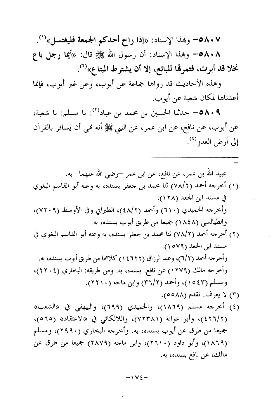 5809- حَدَّثنا الحسين بن مُحَمد بن عباد، حَدَّثنا مسلم، حَدَّثنا شُعْبَةُ، عَن أَيُّوبَ، عَن نافعٍ، عَن ابْنِ عُمَر، عَن النَّبِيّ صَلَّى اللَّهُ عَلَيه وَسَلَّم؛ أَنَّه نَهَى أَنْ يُسَافَرَ بِالْقُرْآنِ إِلَى أَرْضِ الْعَدُوِّ.