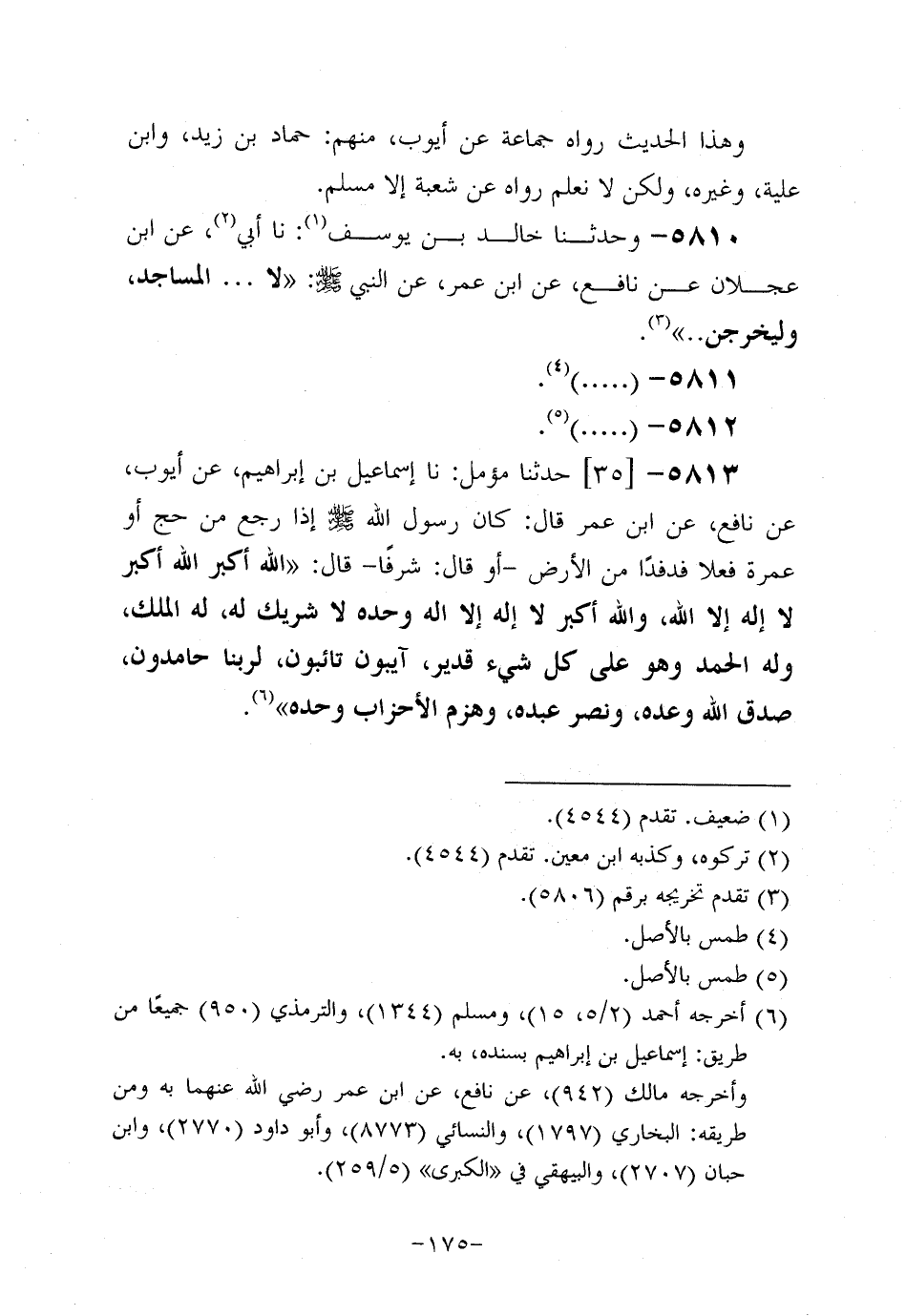 5813- حَدَّثنا مُؤَمَّل، حَدَّثنا إِسْمَاعِيلُ بْنُ إِبْرَاهِيمَ، عَن أَيُّوبَ، عَن نافعٍ، عَن ابْنِ عُمَر قَالَ: كَانَ رَسُولُ اللَّهِ صَلَّى اللَّهُ عَلَيه وَسَلَّم إِذَا رَجَعَ مِنْ حَجٍّ، أَوْ عُمْرَةٍ فَعَلا فَدْفَدًا مِنَ الأَرْضِ، أَوْ قَالَ: شَرَفًا قَالَ: اللَّهُ أَكْبَرُ اللَّهُ أَكْبَرُ لا إِلَهَ إلاَّ اللَّهُ والله أكبر لا إله إلاَّ اله وَحْدَهُ لا شَرِيكَ لَهُ لَهُ الْمُلْكُ وَلَهُ الْحَمْدُ، وهُو عَلَى كُلِّ شَيْءٍ قَدِيرٌ آيِبُونَ تَائِبُونَ لِرَبِّنَا حَامِدُونَ صَدَقَ اللَّهُ وَعْدَهُ وَنَصَرَ عَبده وهزم الأحزام وحده.